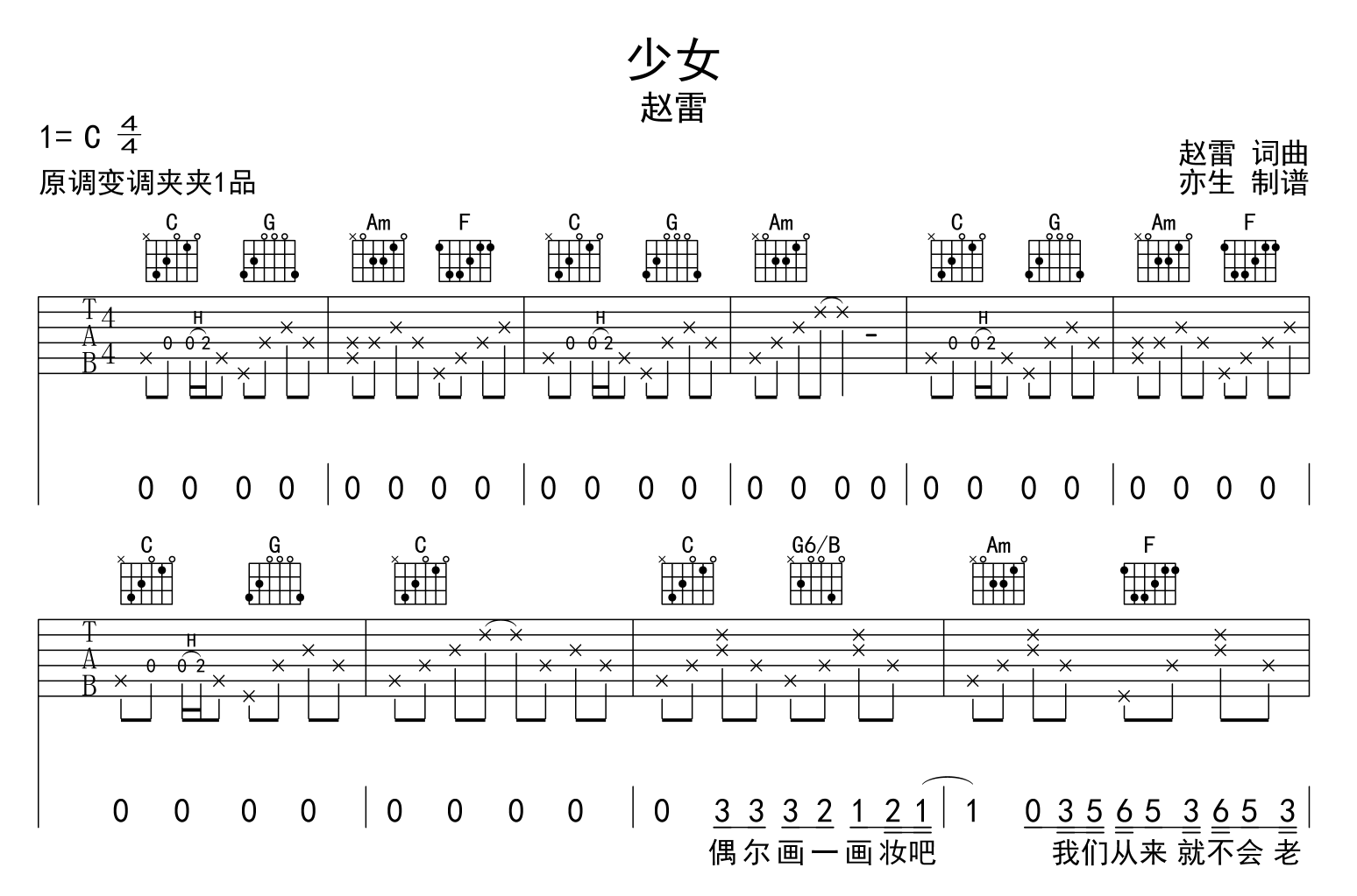 曲谱介绍: 少女吉他谱,赵雷演唱,《少女》吉他弹唱谱,由@亦生扒谱编配分享,本吉他谱采用C调和弦指法编配,推荐变调夹夹第1品演奏,节奏4/4拍,演奏的速度控制在每分钟95拍左右,演奏难度简单,共3张高清图片谱例。