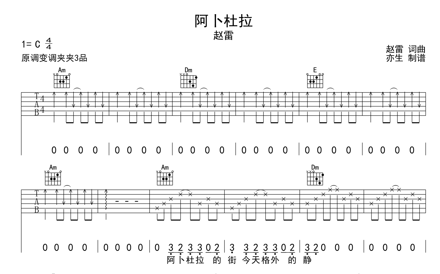 曲谱介绍: 《阿卜杜拉》吉他谱,赵雷演唱,《阿卜杜拉》吉他弹唱谱,由@亦生扒谱编配,本吉他谱采用C调和弦指法编配,推荐变调夹夹第3品演奏,节奏4/4拍,演奏的速度控制在每分钟95拍左右,演奏难度简单,共4张高清图片谱例。