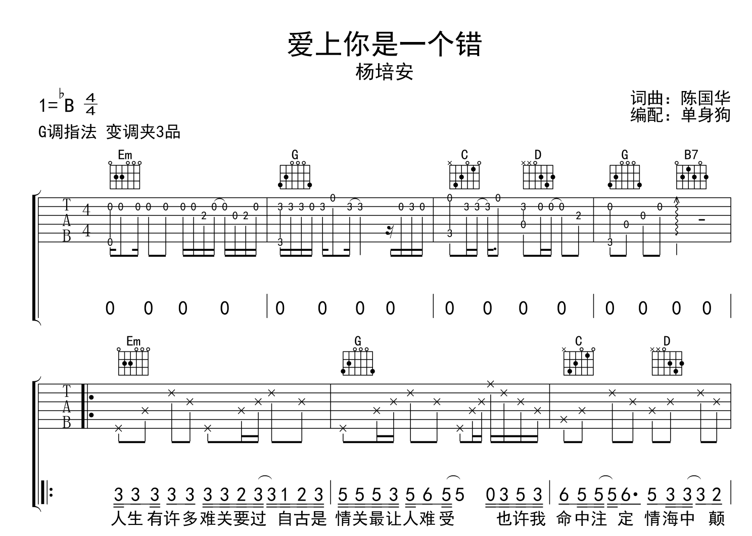 曲谱介绍: 爱上你是一个错吉他谱,杨培安演唱,《爱上你是一个错》吉他弹唱谱,选用G调指法,原调bB,CAPO夹3品弹唱原调,节奏4/4拍,本吉他谱由单身狗制谱分享,共3张高清图片谱。