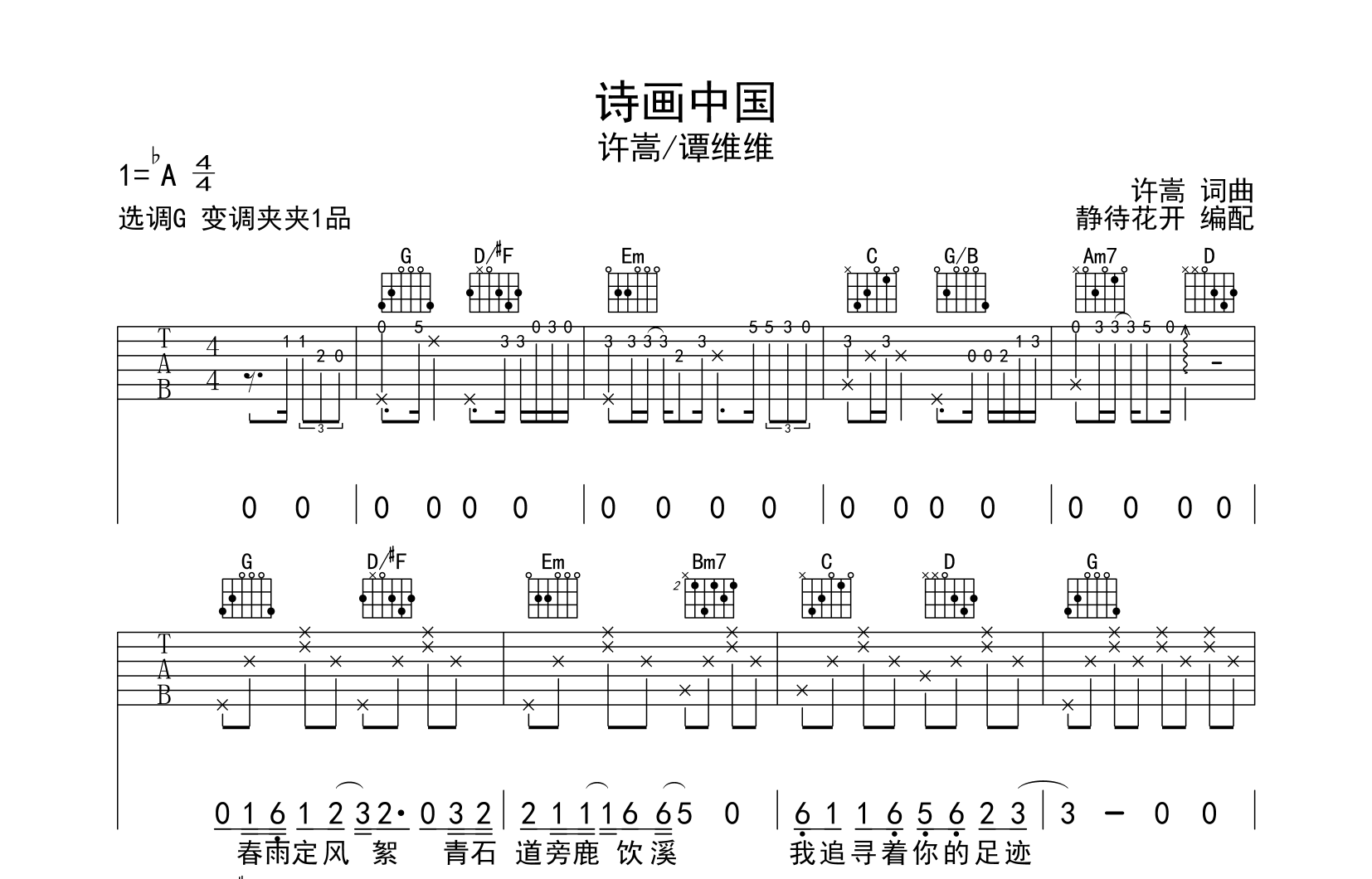 曲谱介绍: 《诗画中国》吉他谱,许嵩谭维维演唱的《诗画中国》主题曲吗,来自@静待花开编配扒谱制作,本吉他谱采用G调和弦指法编配,推荐变调夹夹第1品演奏,原调bA调,也可以根据个人嗓音条件灵活选择变调夹位置,演奏的速度控制在每分钟80拍左右,演奏难度简单,共有3张图片谱例。