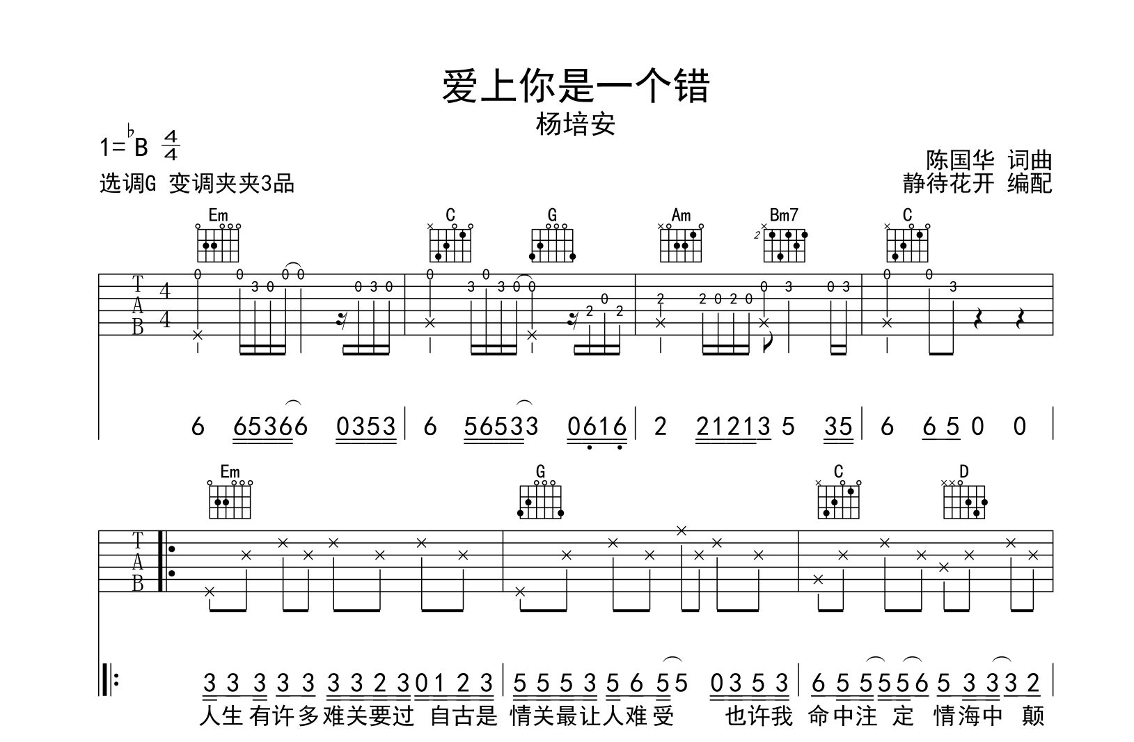 曲谱介绍: 爱上你是一个错吉他谱,杨培安演唱,《爱上你是一个错》吉他弹唱谱,来自@静待花开编配扒谱制作,本吉他谱采用G调和弦指法编配,推荐变调夹夹第3品演奏,原调bB调,也可以根据个人嗓音条件灵活选择变调夹位置,演奏的速度控制在每分钟90拍左右,演奏难度简单。