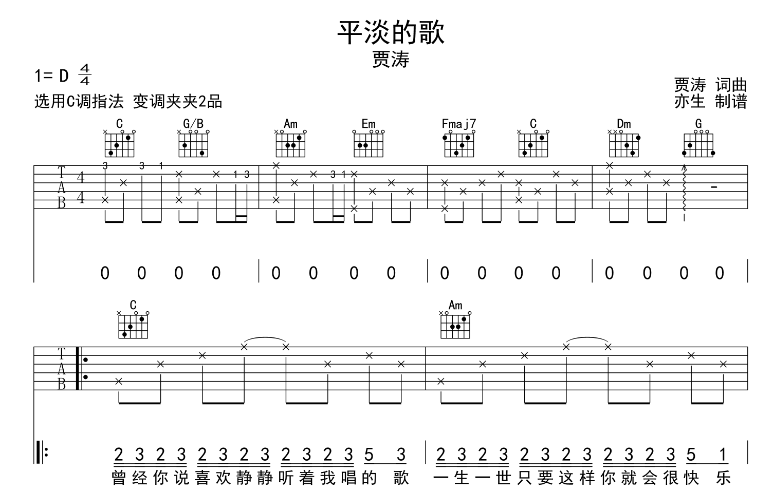 曲谱介绍: 《平淡的歌》吉他谱,贾涛演唱的歌曲,《平淡的歌》吉他弹唱谱,由@亦生制谱分享,本吉他谱采用C调和弦指法编配,推荐变调夹夹第2品演奏,节奏4/4拍,演奏的速度控制在每分钟95拍左右,演奏难度简单。