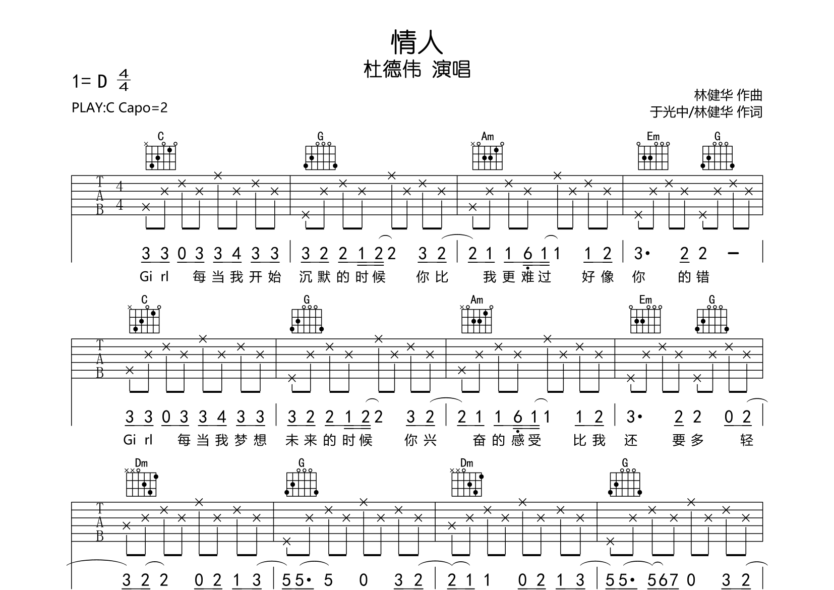 情人吉他谱 - 杜德伟 - C调吉他弹唱谱