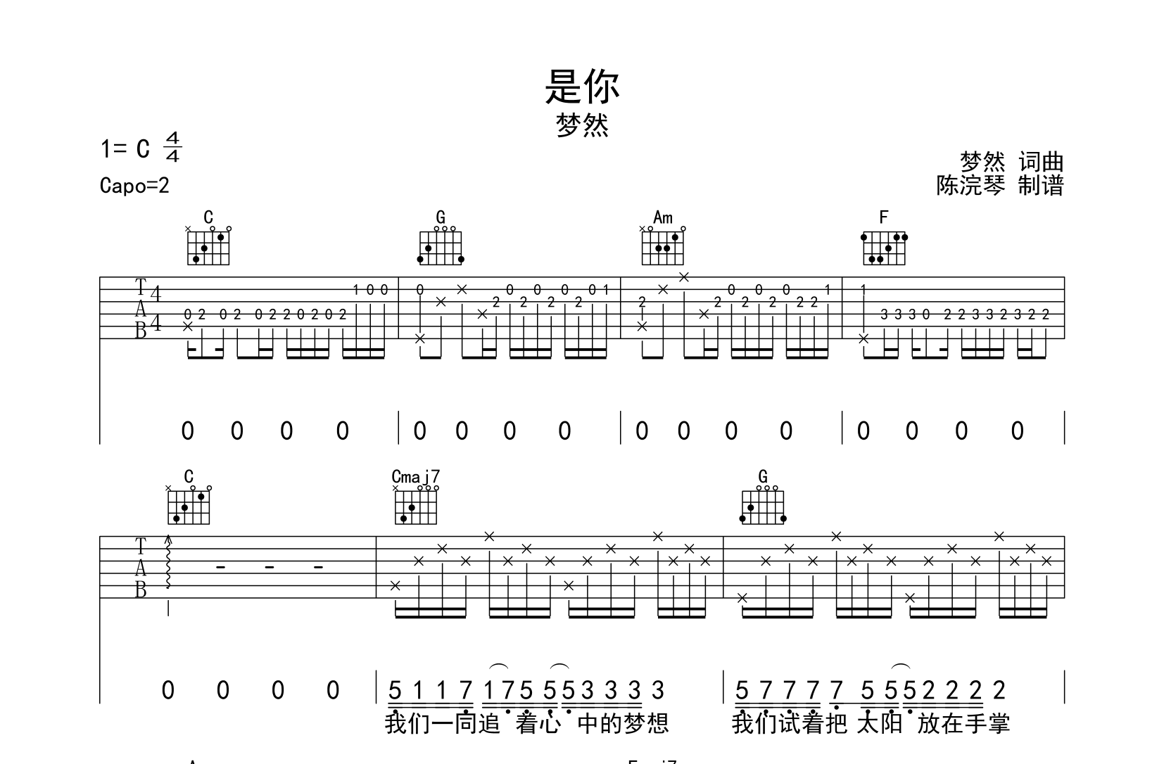 曲谱介绍: 《是你》吉他谱,梦然演唱,《是你》吉他弹唱谱,由@陈浣琴演唱,本吉他谱选用C调指法编配,变调夹夹2品弹唱原调,节奏4/4拍,含前奏按原版编配,难度较简单,共有3张高清图片谱。