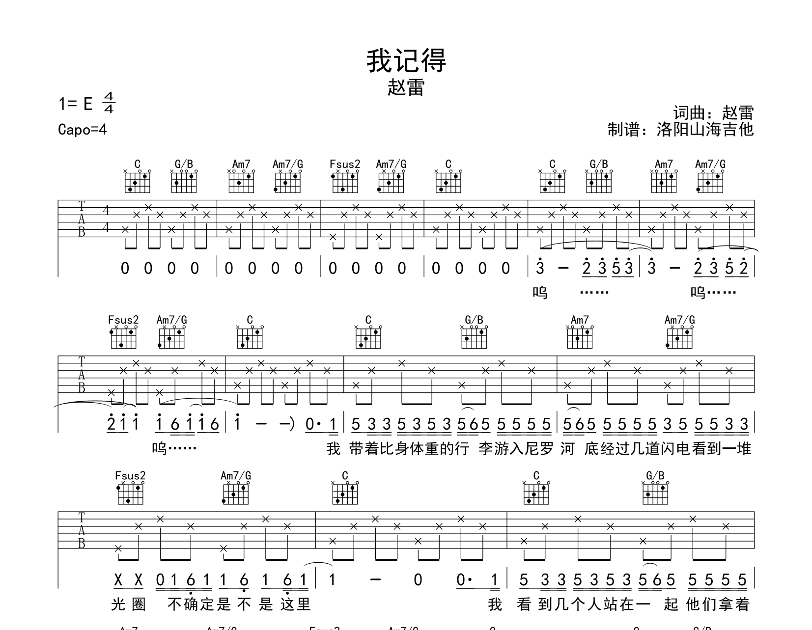 曲谱介绍: 《我记得》吉他谱,赵雷演唱,《我记得》吉他弹唱谱,由@洛阳山海吉他制谱分享,选用C调指法,原调E调,CAPO夹4品弹唱原调,节奏4/4拍,难度较简单,共有3张高清图片谱例。