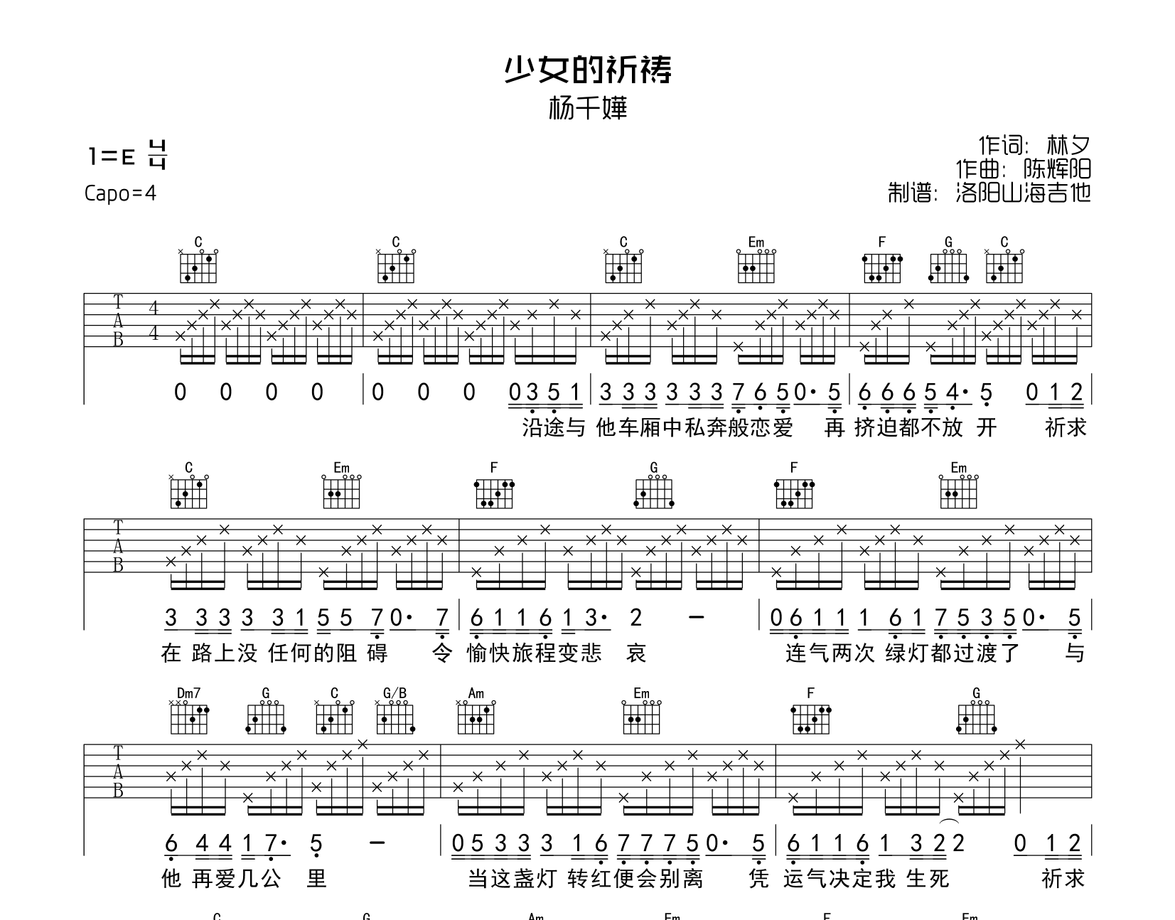 曲谱介绍: 《少女的祈祷》吉他谱,杨千嬅演唱,《少女的祈祷》吉他弹唱谱,由@洛阳山海吉他制谱分享,本吉他谱选用G调指法,原调E调,CAPO夹4品弹唱原调,节奏4/4拍,共有2张高清图片谱例。