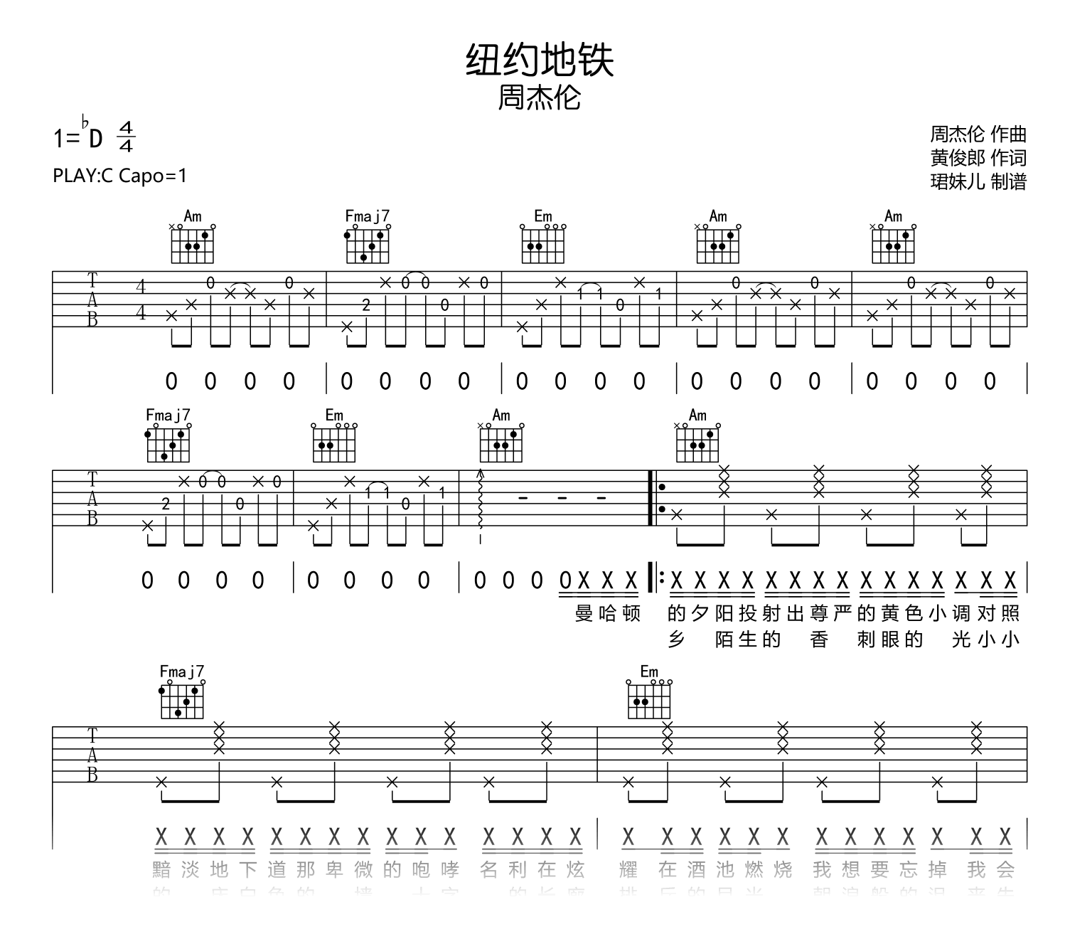纽约地铁吉他谱 - 周杰伦 - C调吉他弹唱谱