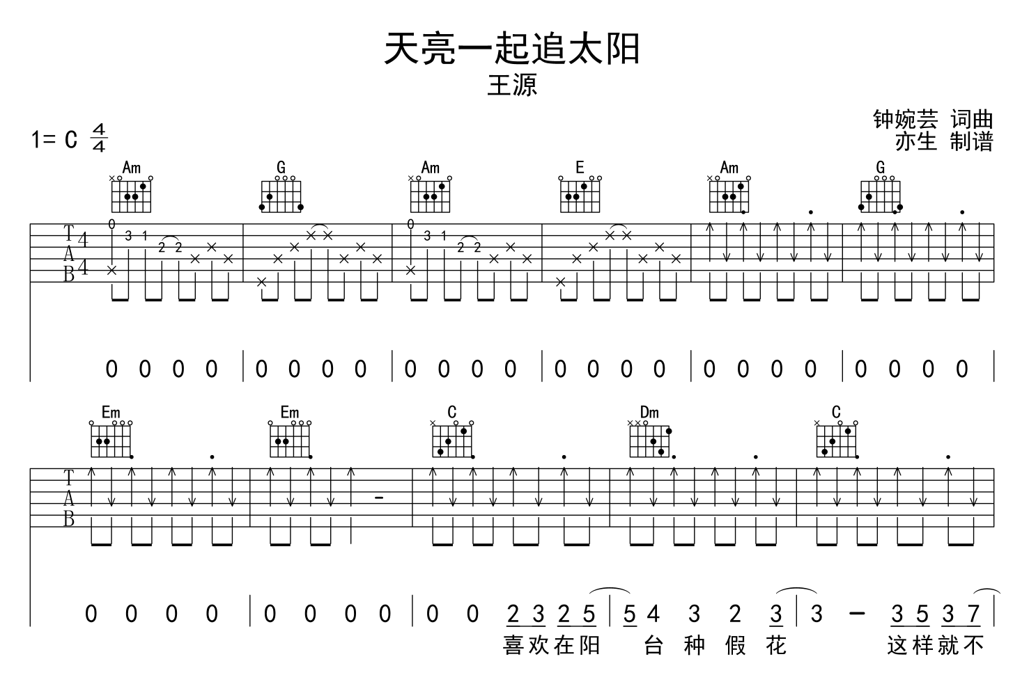 曲谱介绍: 天亮一起追太阳吉他谱,王源演唱,《天亮一起追太阳》吉他弹唱谱,由@亦生制谱,本吉他谱采用C调指法,节奏4/4拍,速度100BPM,变调夹可以不夹,难度简单。完整曲谱共有2张高清图片谱例。