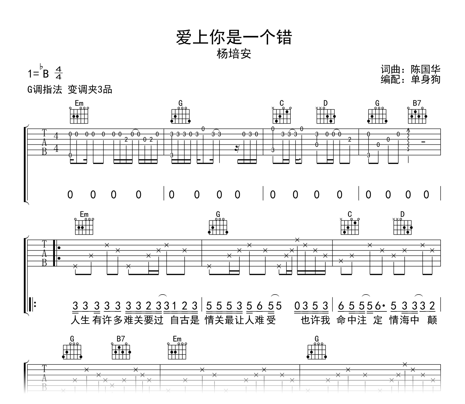 曲谱介绍: 爱上你是一个错吉他谱,杨培安一首经典伤感情歌,老歌又登音乐榜了,直白通俗的歌词触动人心,琅琅上口的旋律抓人耳朵,引起无数人情感的共鸣。 《爱上你是一个错》六线谱,原调降B,选调G调,变调夹夹二品,完整版共三张高清图片谱例。
