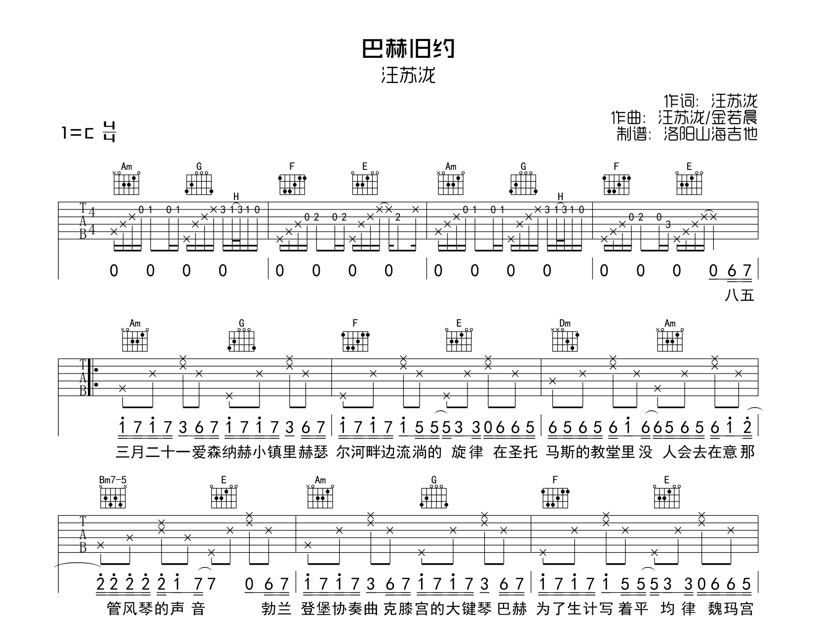 曲谱介绍: 《巴赫旧约》吉他谱,汪苏泷演唱,《巴赫旧约》吉他弹唱谱,由@洛阳山海吉他制谱,本吉他谱选用C调指法,标准调音弹唱无需使用变调夹,节奏4/4拍,共有2张高清图片谱例。