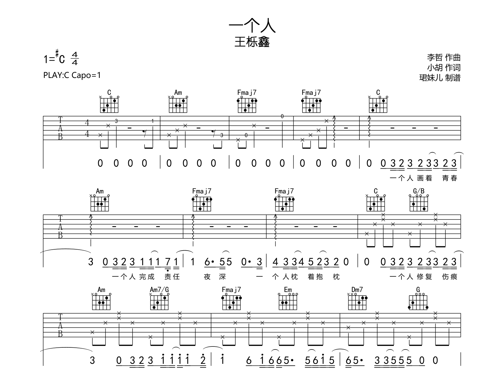 曲谱介绍: 《一个人》吉他谱,王栎鑫演唱的歌曲,《一个人》吉他弹唱谱,由@珺妹儿扒谱编配分享,本吉他谱采用C调指法编配,弹唱建议变调夹1品,速度85BPM,难度较简单,易上手,共有2张高清图片谱。
