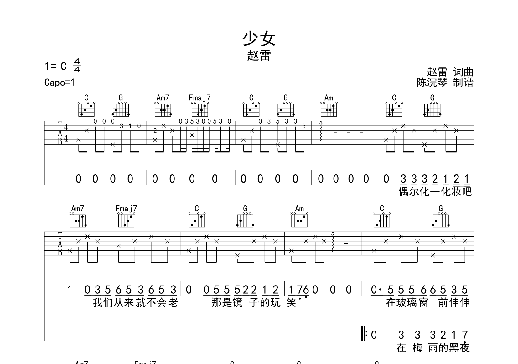 曲谱介绍: 少女吉他谱,赵雷演唱的歌曲,《少女》吉他弹唱谱,由@陈浣琴制谱,C调指法编配吉他谱,变调夹夹1品弹唱原调D调,难度简单,共三张图谱。