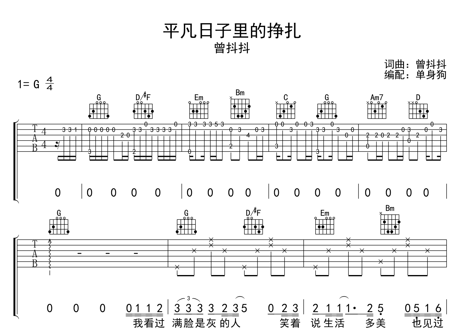 曲谱介绍: 平凡日子里的挣扎吉他谱,曾抖抖演唱的歌曲,《平凡日子里的挣扎》吉他弹唱谱,选用G调指法编配,标准调音可不用变调夹弹唱,节奏4/4拍,难度较简单,本吉他谱由@单身狗编配制谱,共有3张高清图片谱例。