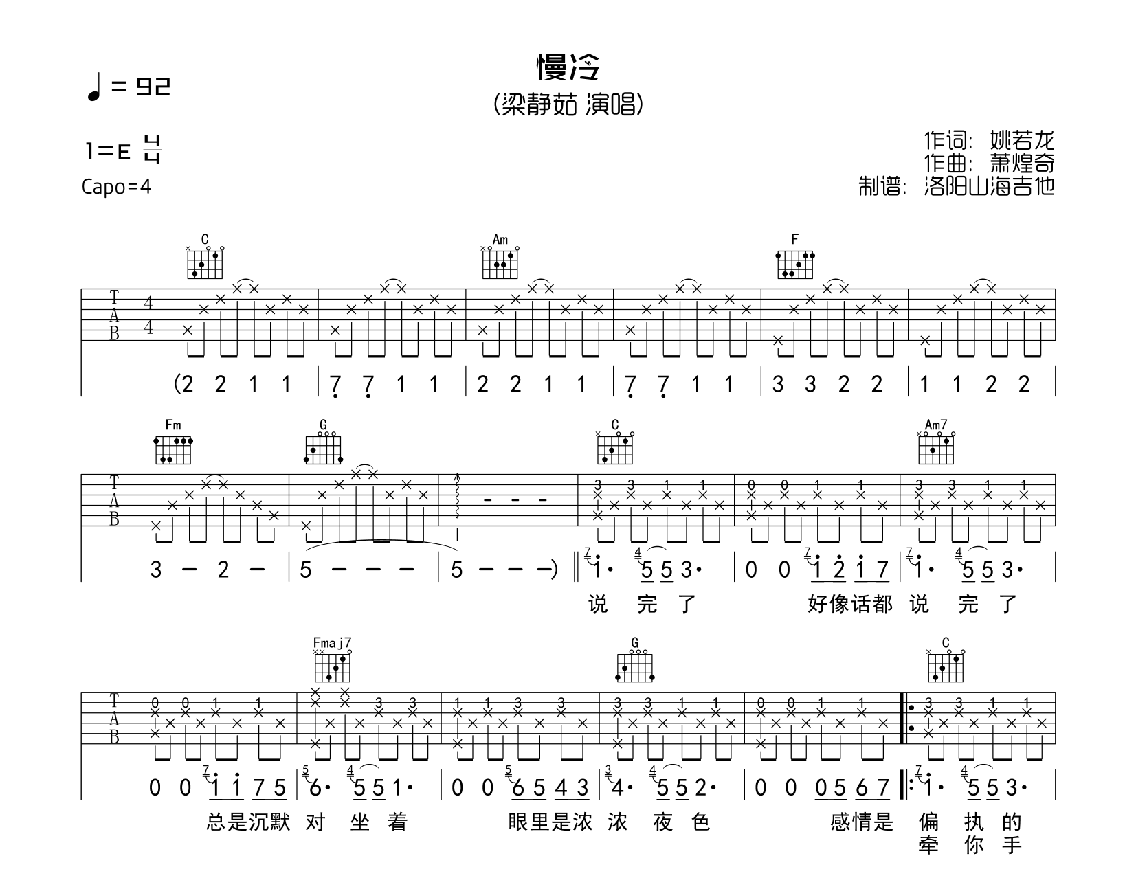 曲谱介绍: 《慢冷》吉他谱,梁静茹演唱的歌曲,《慢冷》吉他弹唱谱,由@洛阳山海吉他编配制谱,本吉他谱选用C调指法,原调E调,速度控制在92拍每分钟,节奏4/4拍,难度较简单,共有3张高清图片谱。