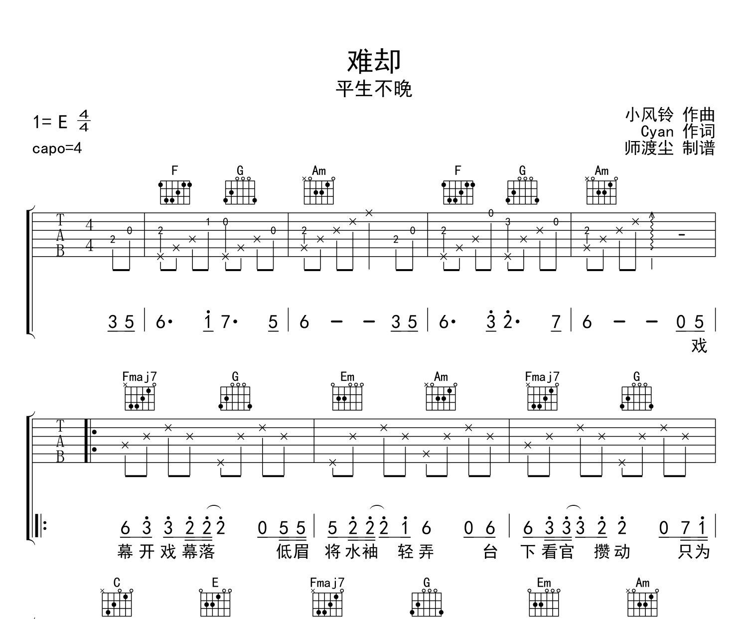 曲谱介绍: 难却吉他谱,来自@师渡尘编配扒谱制作,本吉他谱采用C调和弦指法编配,推荐变调夹夹第4品演奏,原调E调,也可以根据个人嗓音条件灵活选择变调夹位置,演奏的速度控制在每分钟80拍左右,演奏难度简单。
