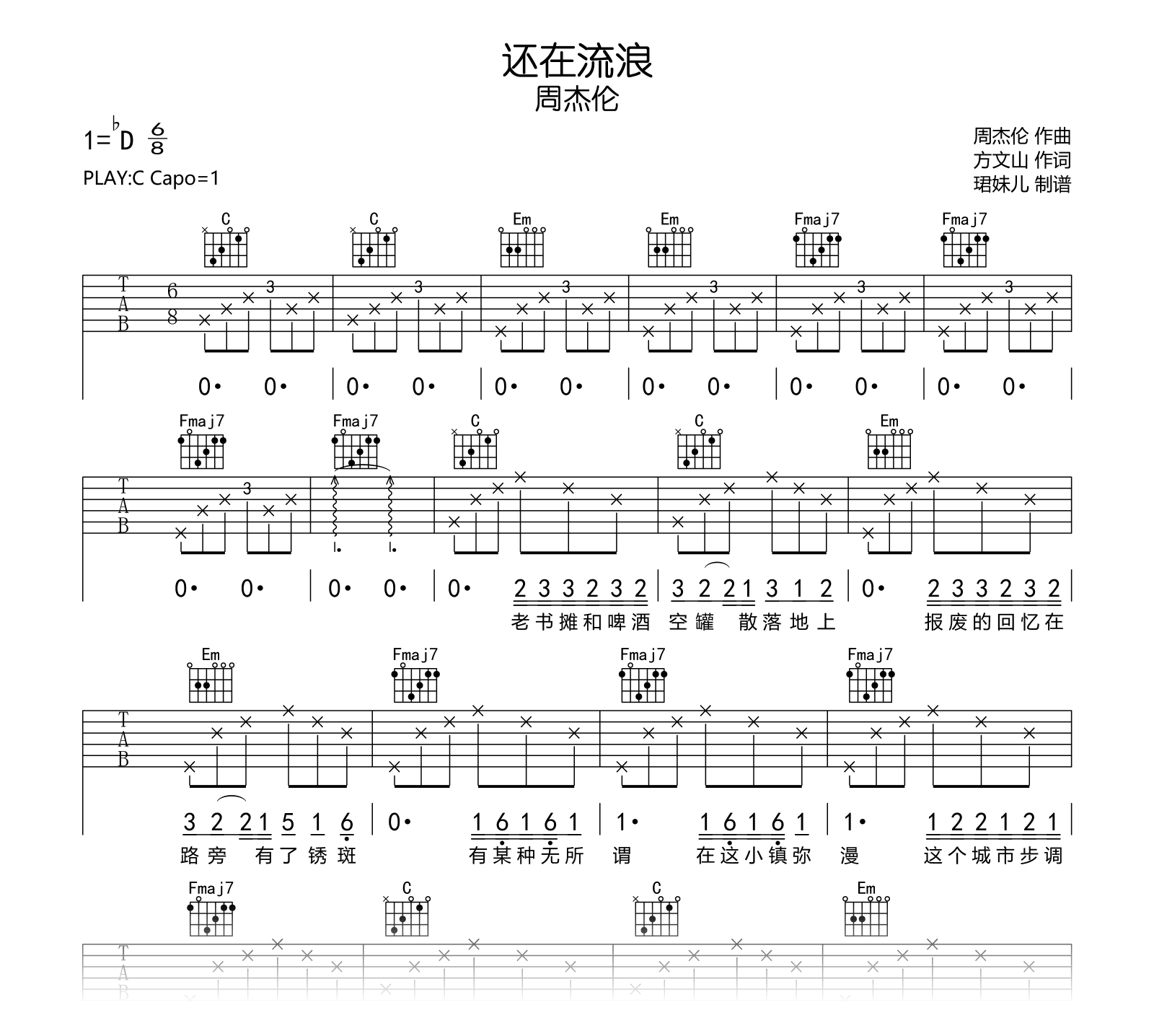 曲谱介绍: 还在流浪吉他谱,周杰伦演唱,《还在流浪》吉他弹唱谱,原调bD,采用C调指法编配,弹唱建议变调夹一品,速度95BPM,演奏较简单,难度易上手。