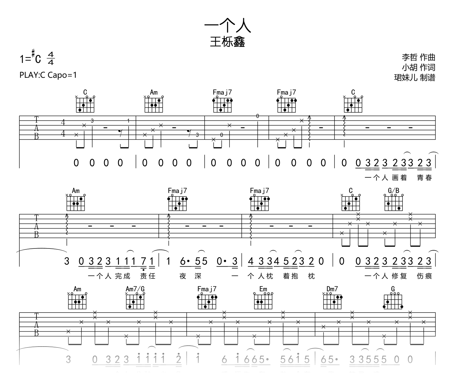 一个人吉他谱 - 王栎鑫 - C调吉他弹唱谱