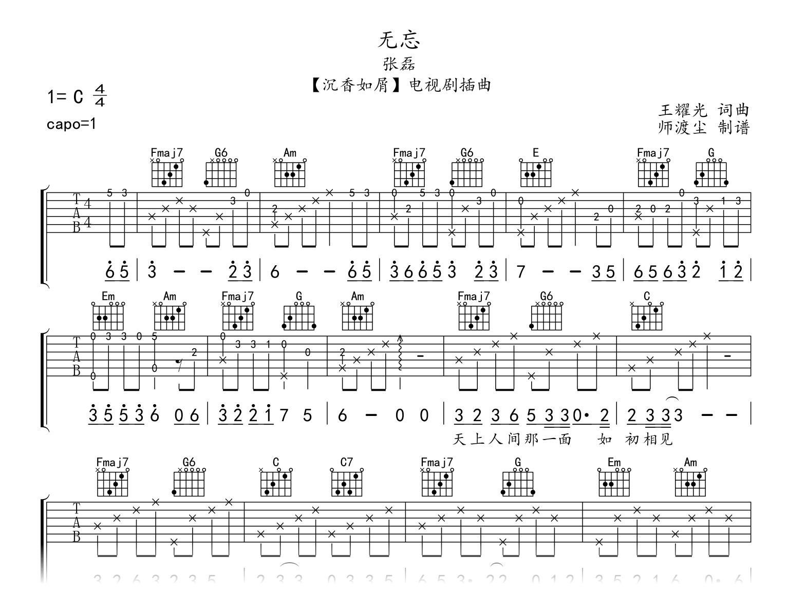 曲谱介绍: 无忘吉他谱,张磊深情献唱热播剧《沉香如屑》插曲。《无忘》吉他弹唱谱,编配扒谱采用C调和弦,Capo夹一品为原调升C调,速度在每分钟72拍左右,演奏难度简单。两张高清图片谱例,附示范音频供同学们练习参考。