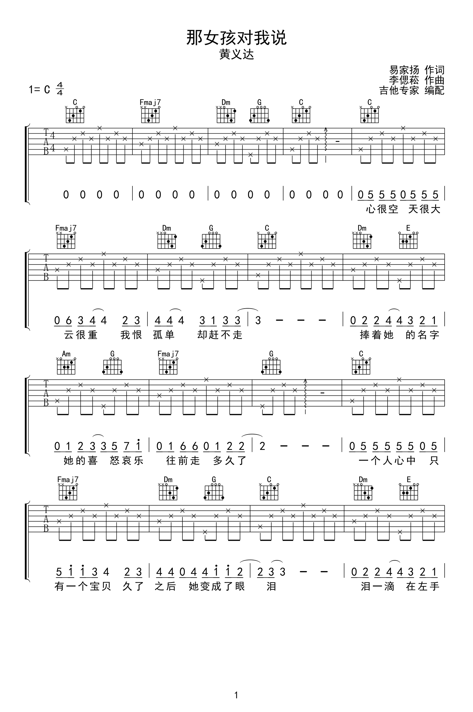 那女孩对我说吉他谱 - 黄义达 - C调吉他弹唱谱