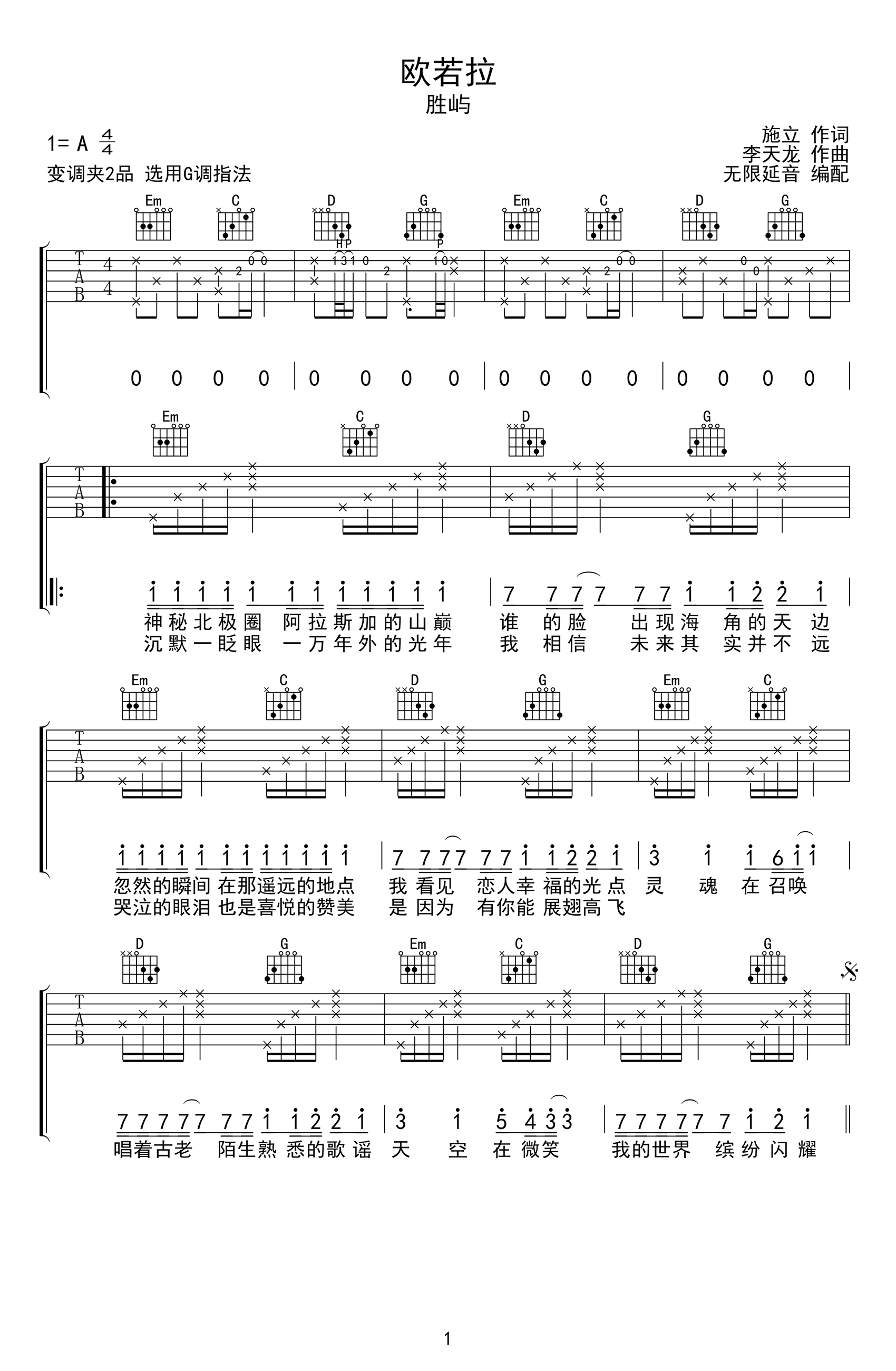 曲谱介绍: 欧若拉吉他谱,胜屿翻唱张韶涵经典歌曲,爷青回旋律太抓耳。 《欧若拉》吉他弹唱谱,原调A,选用G调指法编配,变调夹夹二品,完整版共三张高清图片六线谱。