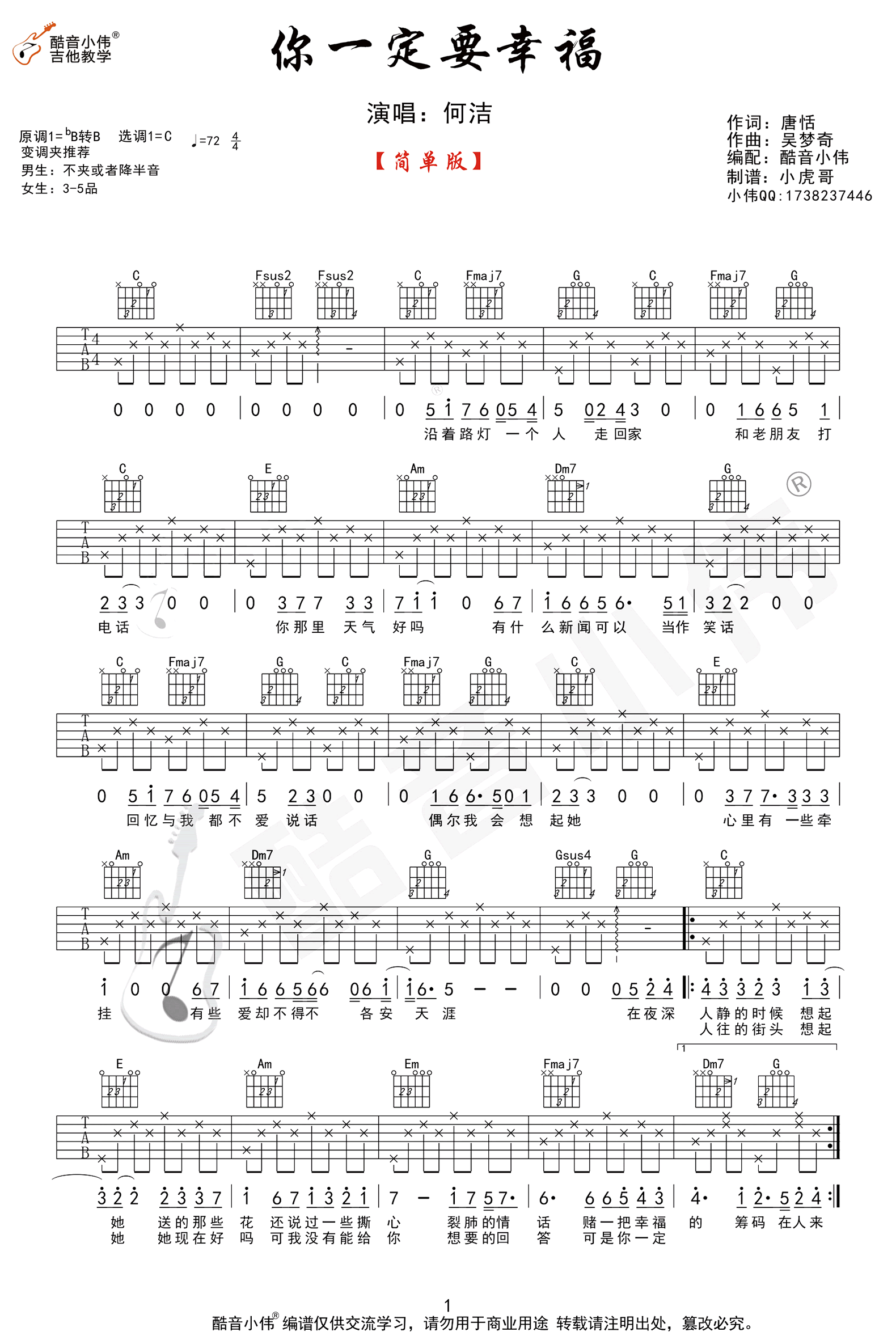 曲谱介绍: 你一定要幸福吉他谱,何洁的一首经典伤感情歌,《你一定要幸福》吉他弹唱谱,选用C调和弦指法,简单版编配,变调夹推荐,男生不夹或降半音调弦,女生3-5品,共两张高清图片六线谱。 曲风伤感但不失平和,歌词直戳泪点,表达了一种经历了极度心痛后的平静,以及经历心碎绝望后的释怀。