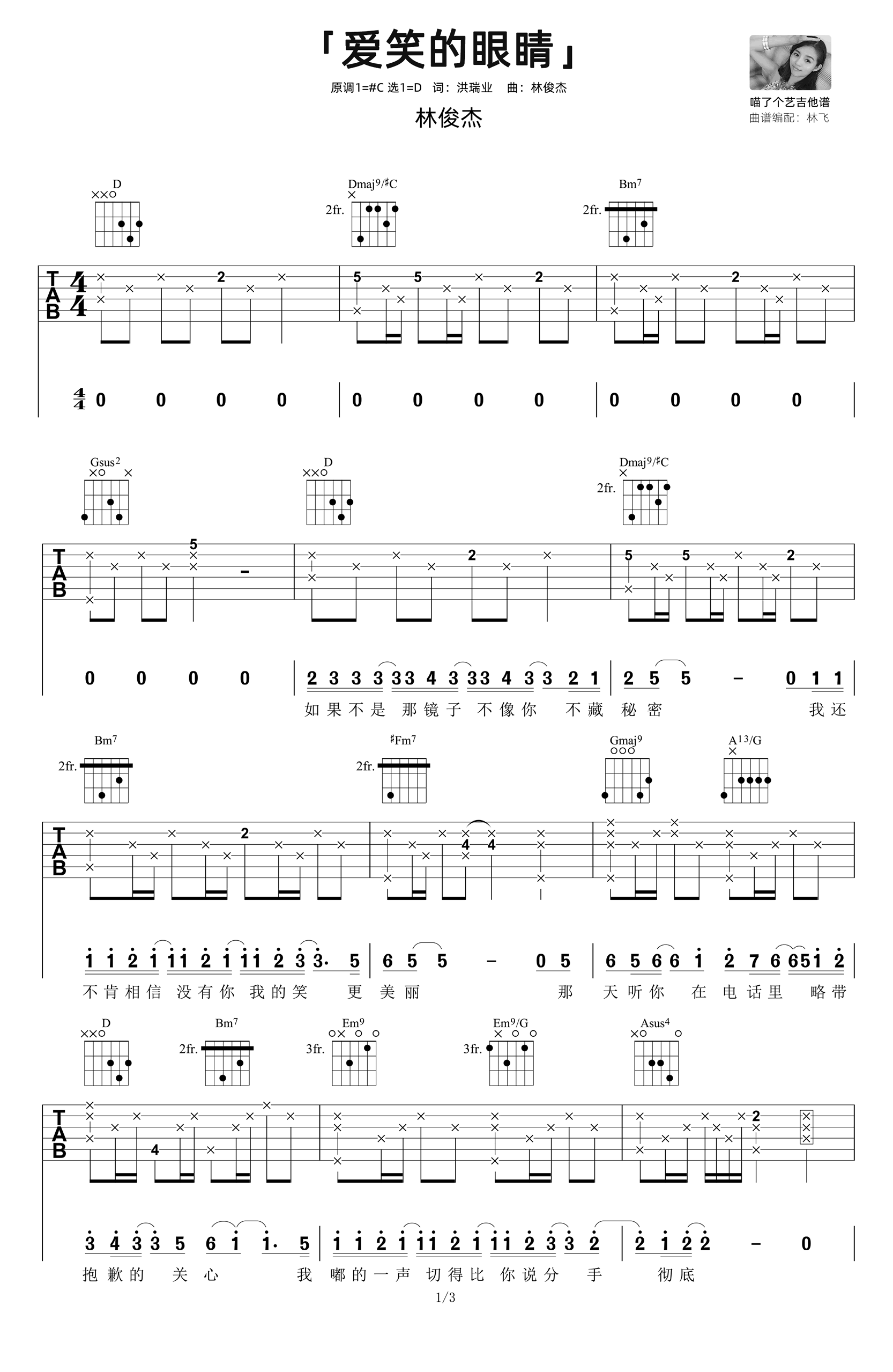 曲谱介绍: 爱笑的眼睛吉他谱,林俊杰演唱,原调升C,选用D调,女声弹唱原版六线谱共三张高清图片。《爱笑的眼睛》吉他弹唱演示视频,琴友们参照练习。 [这爱的城市虽然拥挤,如果真的遇见你,你不必讶异,我的笑TA无法代替],那天以为JJ要唱爱笑的眼睛了,结果没有(咬牙!)林飞老师这次编的谱虽费手但超还原,进阶班曲目+1,冲!