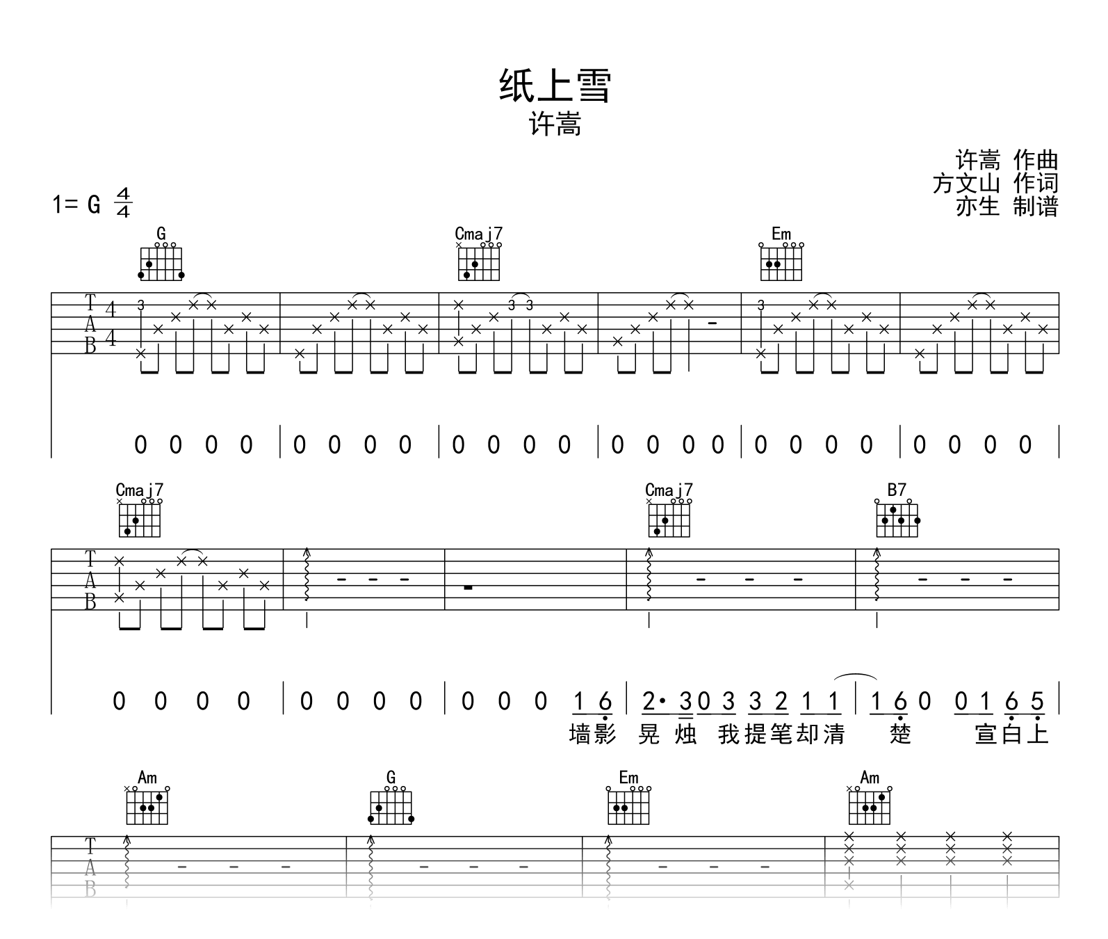 纸上雪吉他谱 - 许嵩 - G调吉他弹唱谱