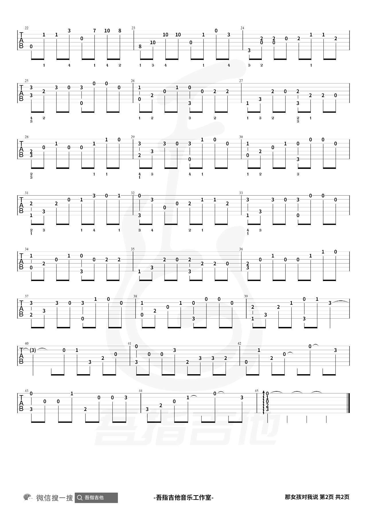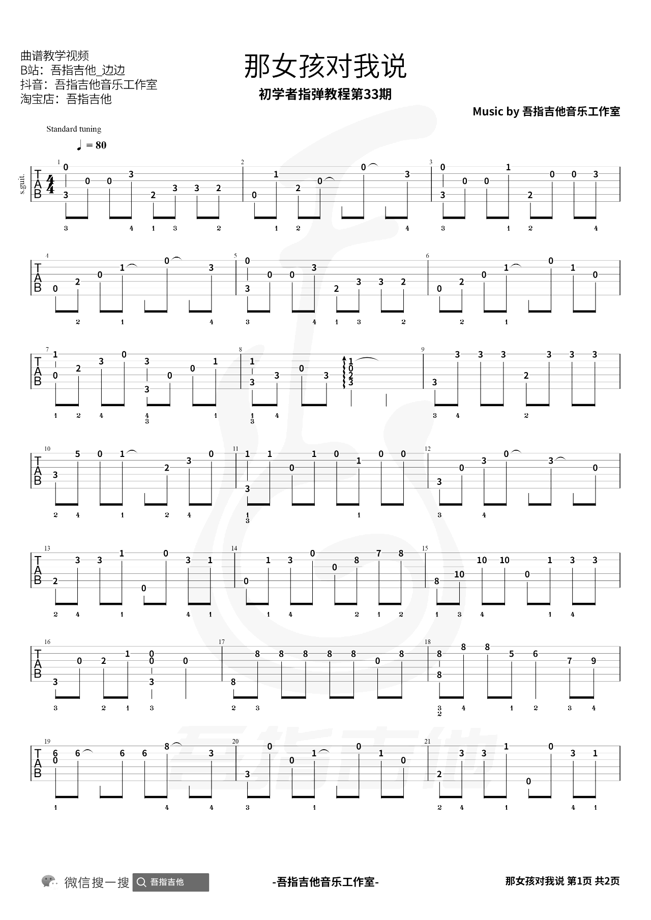 曲谱介绍: 那女孩对我说指弹谱,改编自黄义达的经典代表歌曲,吉他独奏谱简单版编配,两张图片六线谱。同步更新《那女孩对我说》吉他指弹演示教学视频。 大家在看视频学习的时候一定要注意曲谱下方标注的左手指法和教学部分的要点标注哦,即使简单的曲谱也有很多细节可以注意,简单并不等于不好听~