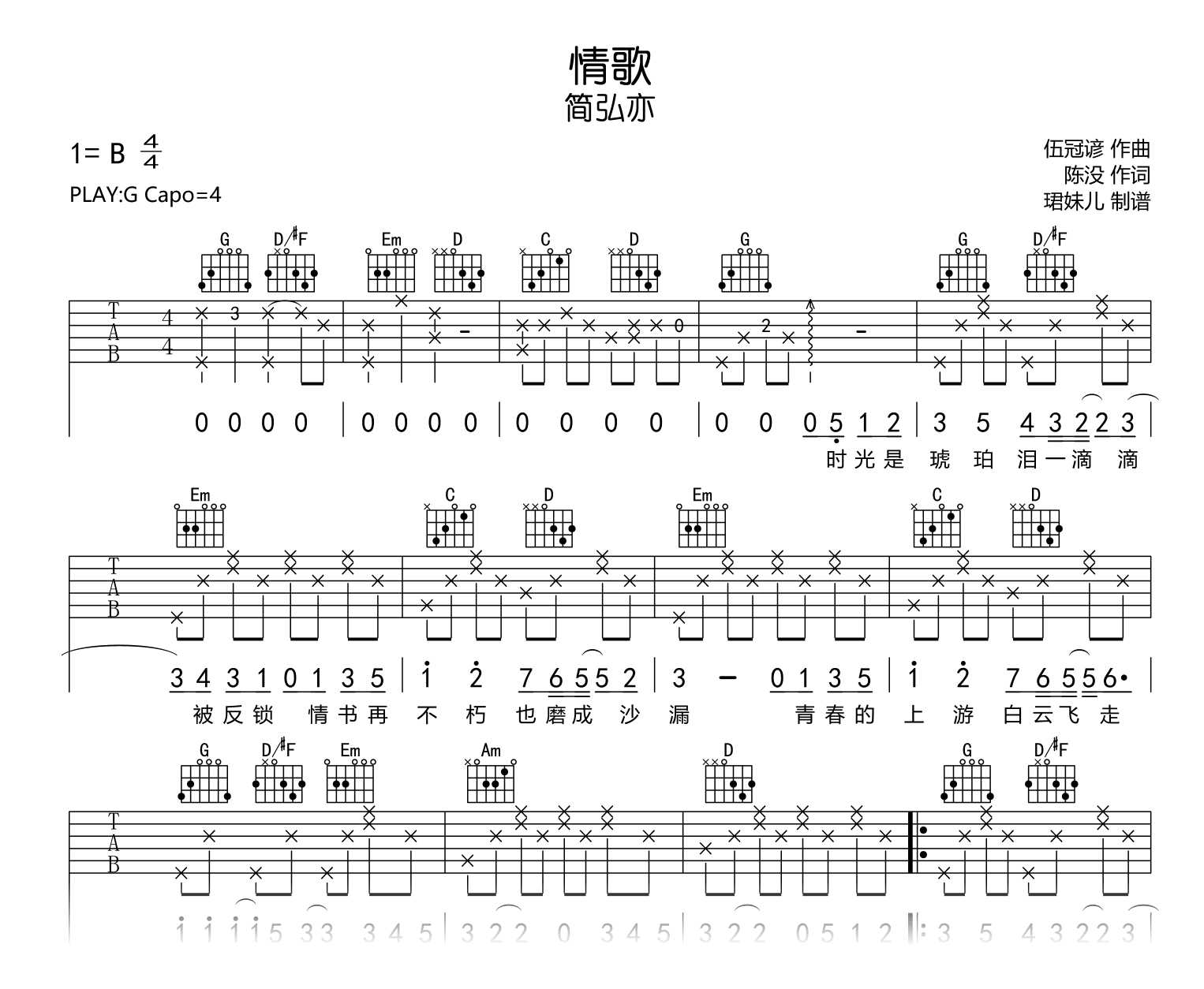 情歌吉他谱 - 简弘亦 - G调吉他弹唱谱