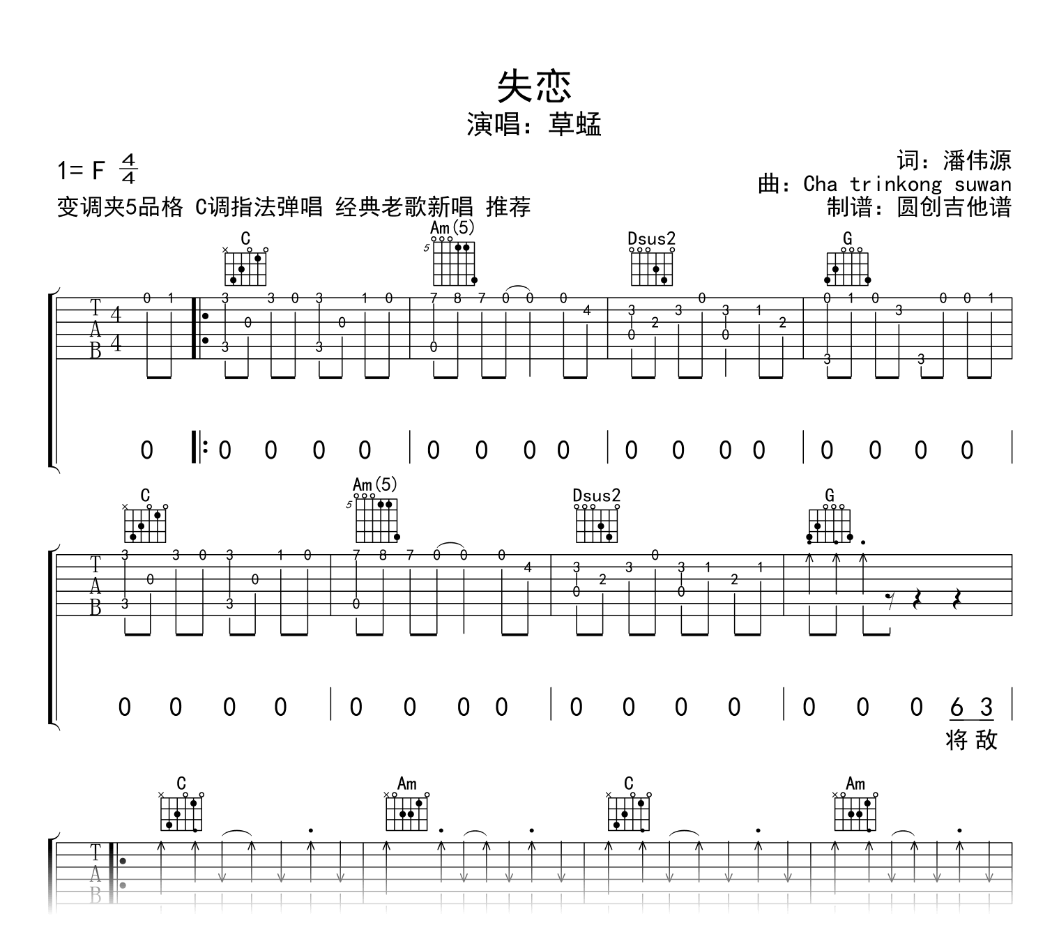 曲谱介绍: 失恋吉他谱,草蜢的一首百听不厌的经典代表作品,老歌新唱朗朗上口,《失恋》吉他弹唱谱,原调F,变调夹夹五品,指法简单,好听好弹,随谱附上音频示范,推荐新手练习。 前奏一起,就忍不住想要跟着抖腿。这首歌俘获了每个年代的人。