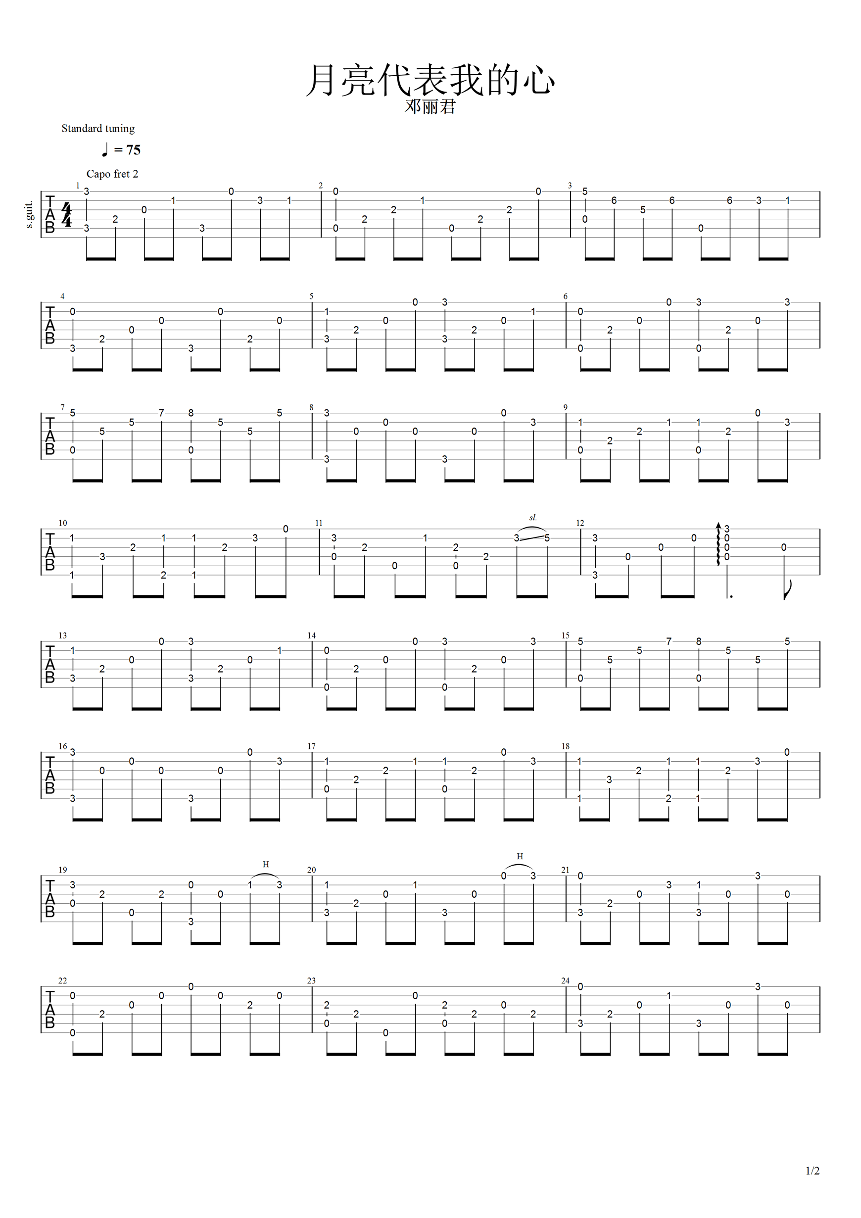 曲谱介绍: 月亮代表我的心吉他指弹谱,邓丽君演唱,华语流行歌曲传世经典。《月亮代表我的心》吉他独奏谱,Capo夹二品,两张图片六线谱。
