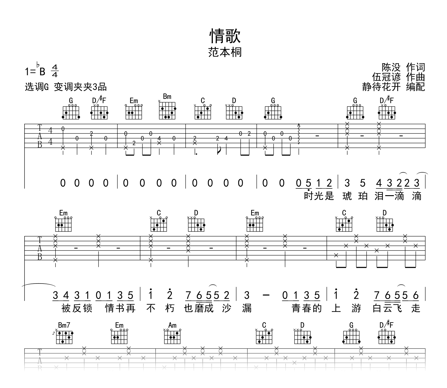 曲谱介绍: 情歌吉他谱,范本桐《中国好声音》节目翻唱梁静茹经典歌曲,磁性嗓子释放独特魅力。《情歌》吉他弹唱谱,原调bB调,编配采用G调和弦指法,变调夹夹第3品,速度在每分钟75拍左右,演奏难度简单。