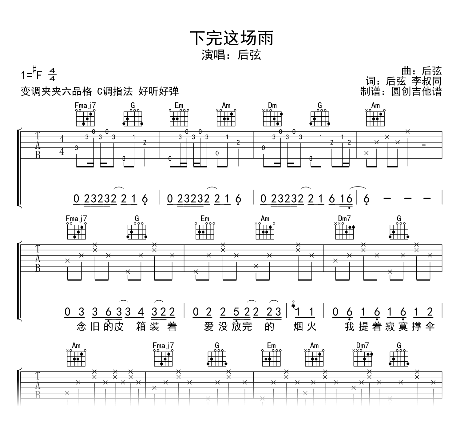 下完这场雨吉他谱 - 后弦 - C调吉他弹唱谱