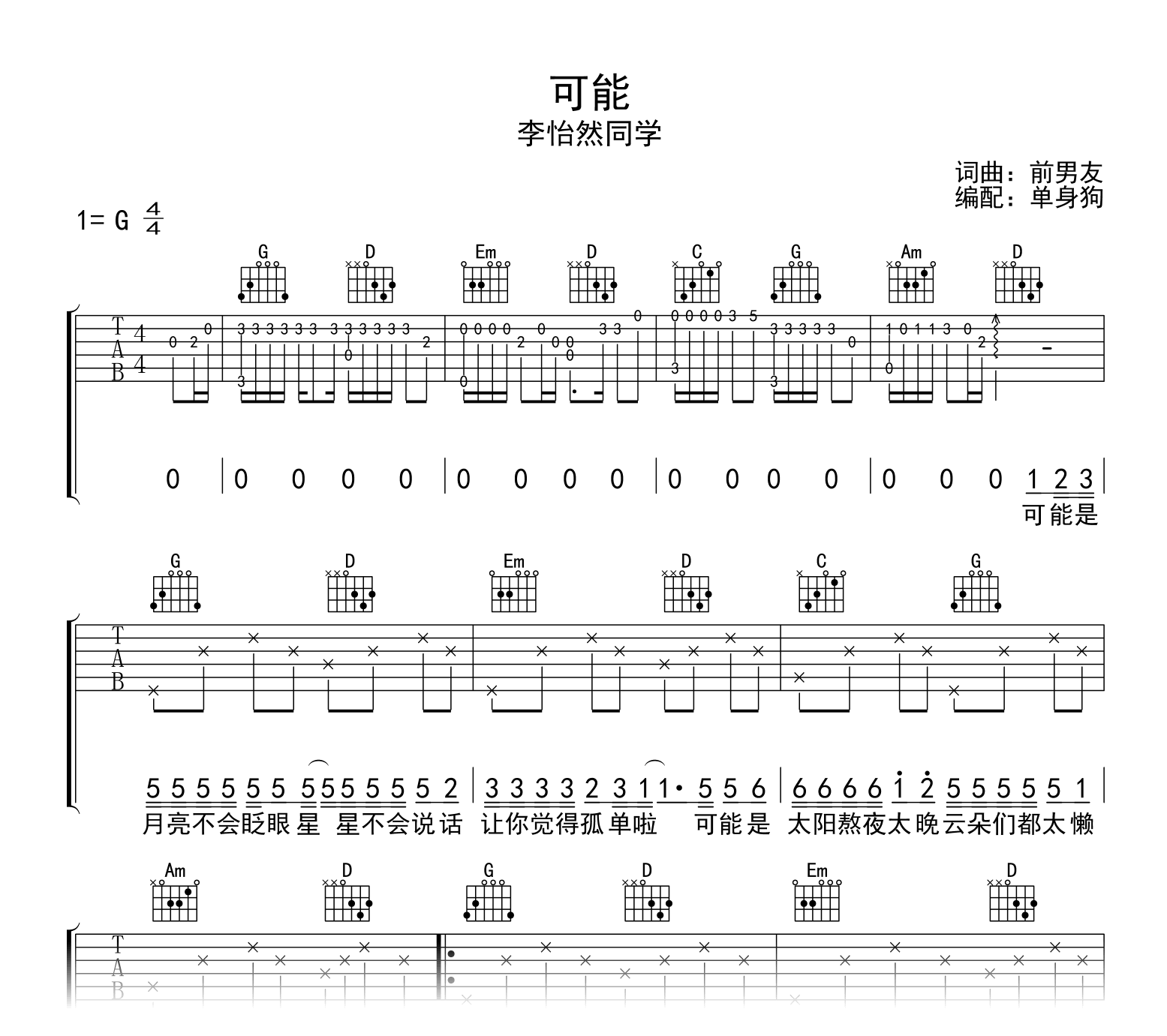 曲谱介绍: 可能吉他谱,李怡然同学演唱的一首治愈歌曲,《可能》吉他弹唱谱,选用G调指法编配,完整版共三张高清图片六线谱。