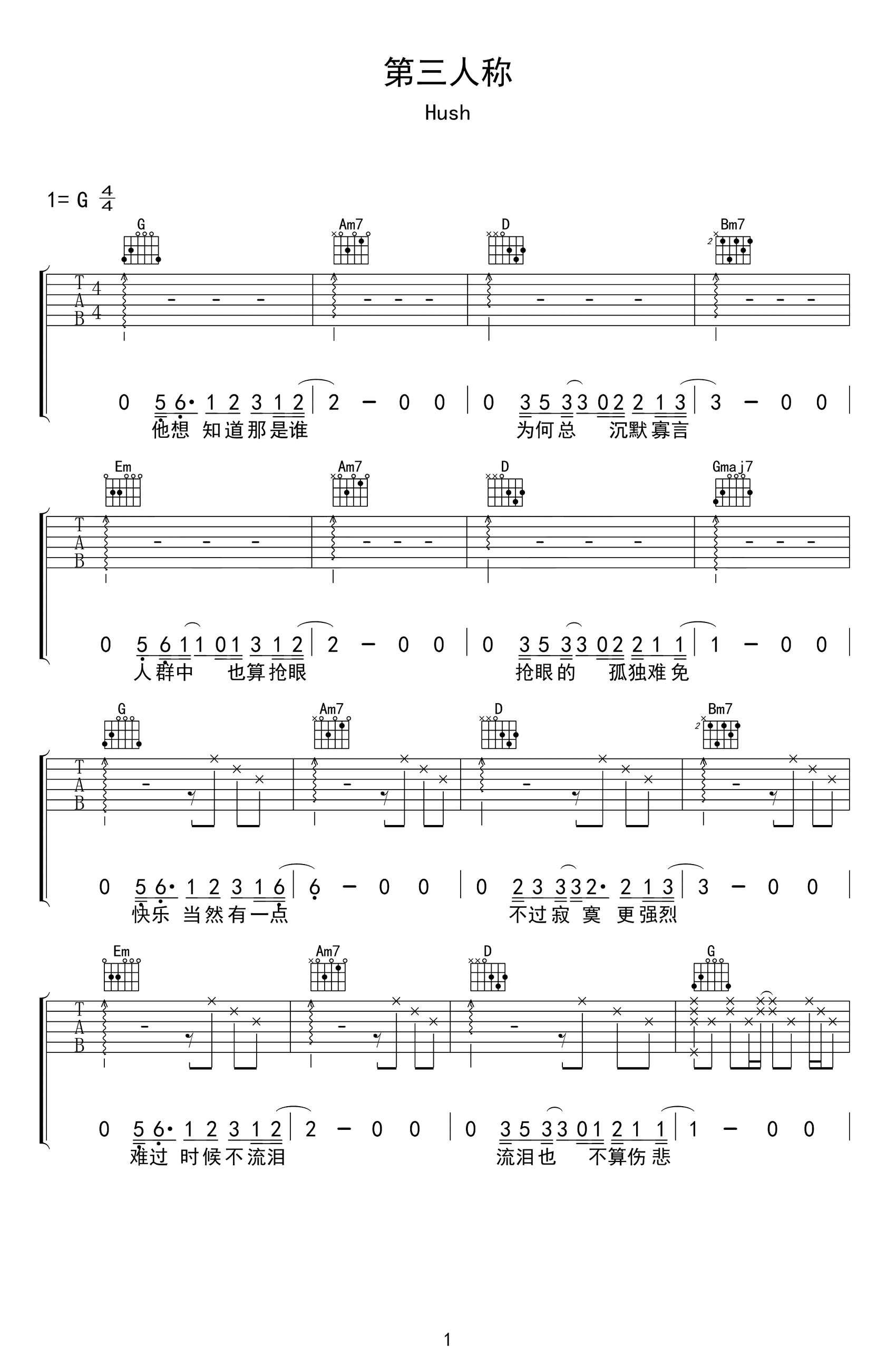 第三人称吉他谱 - Hush - G调吉他弹唱谱