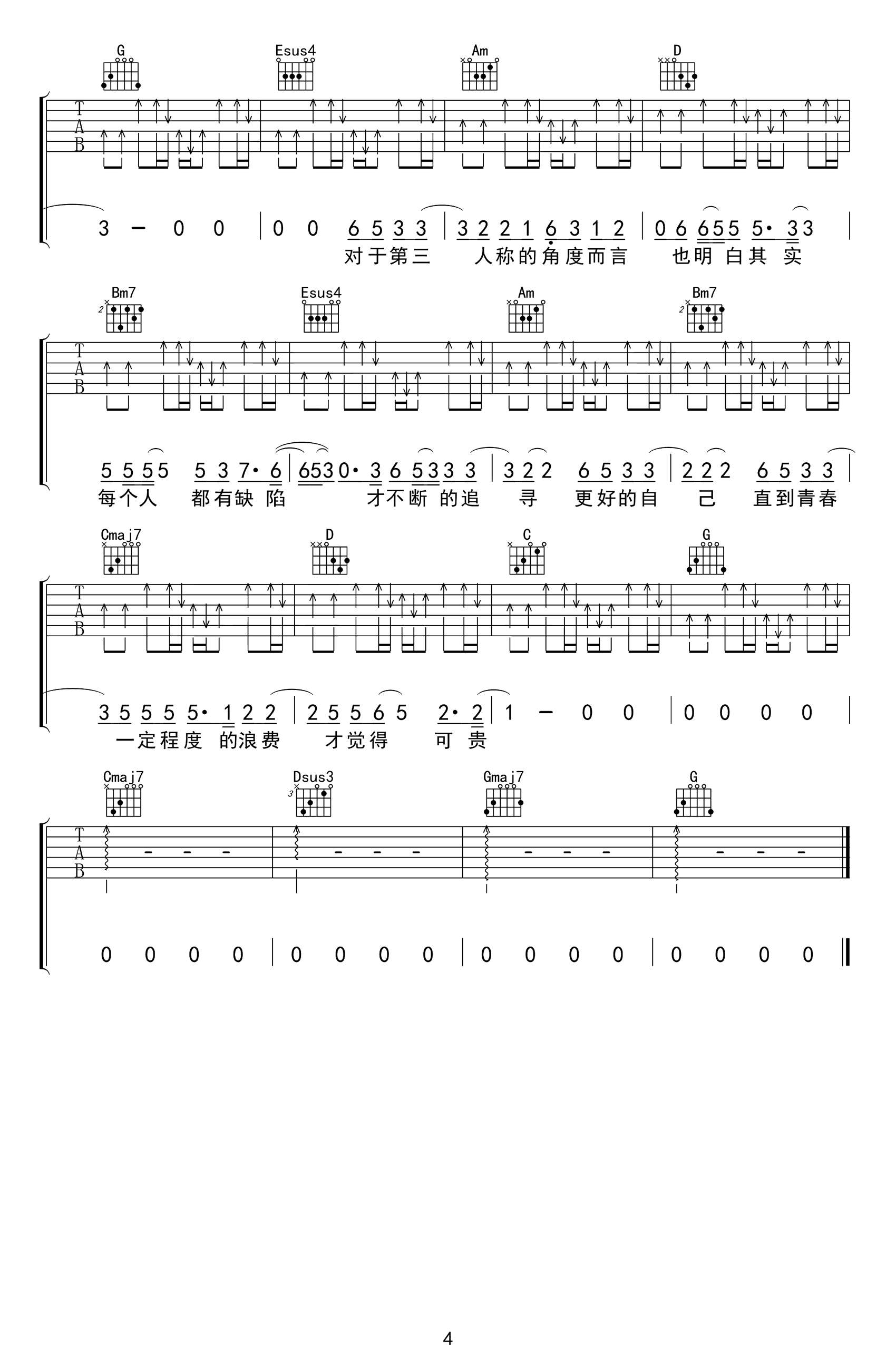 曲谱介绍: 第三人称吉他谱,Hush演唱,一首能让我们深思的歌曲。《第三人称》吉他弹唱谱,选用G调指法编配,完整高清六线谱共四张图片谱例。歌曲伴奏很随意,弹奏时不必按照谱子来,右手的节奏型可以根据自己的习惯和感觉来,只要拍子没有错就好。