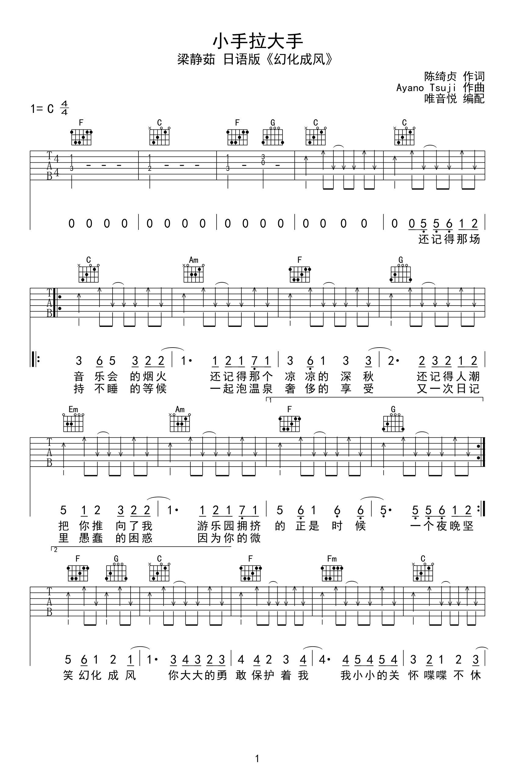 曲谱介绍: 小手拉大手吉他谱,梁静茹翻唱自日剧动漫《猫的报恩》的片尾曲《幻化成风》。《小手拉大手》吉他弹唱谱,选用C调指法编配,完整版共四张高清图片六线谱。