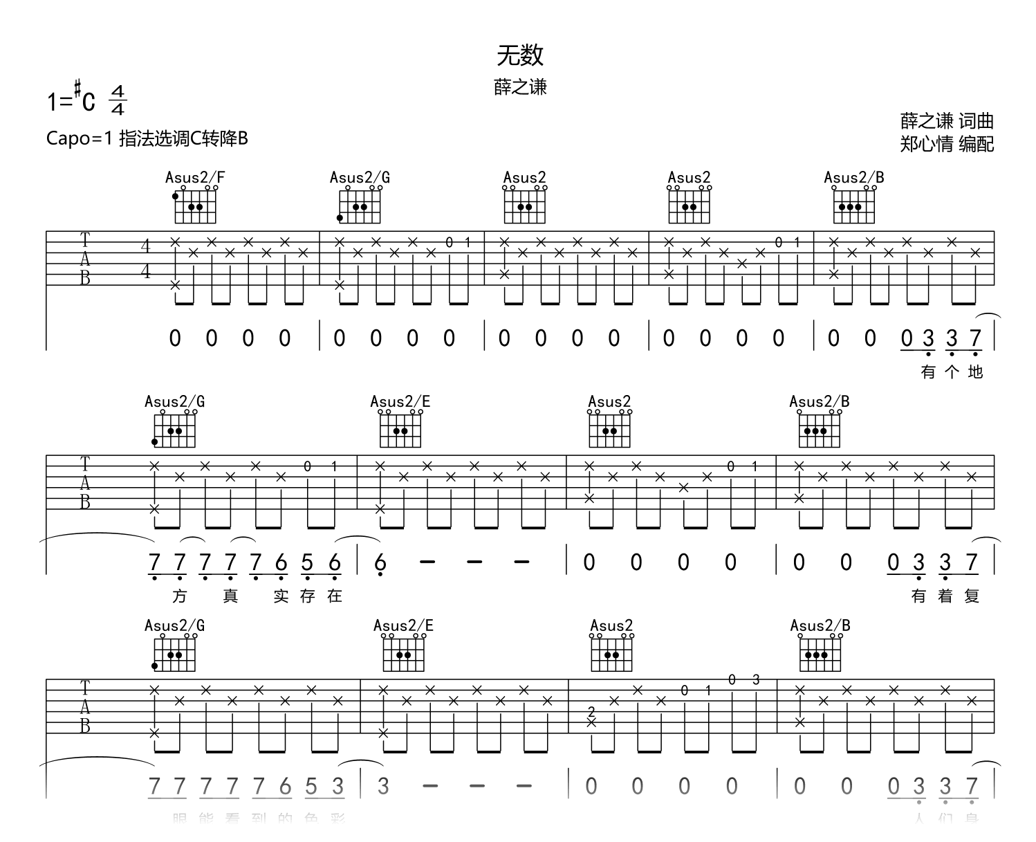 曲谱介绍: 无数吉他谱,薛之谦的新歌单曲,《无数》吉他弹唱谱,原调升C,选用C转降B调的指法编配,变调夹夹1品为原调,也可以根据个人音域调整变调夹的位置。