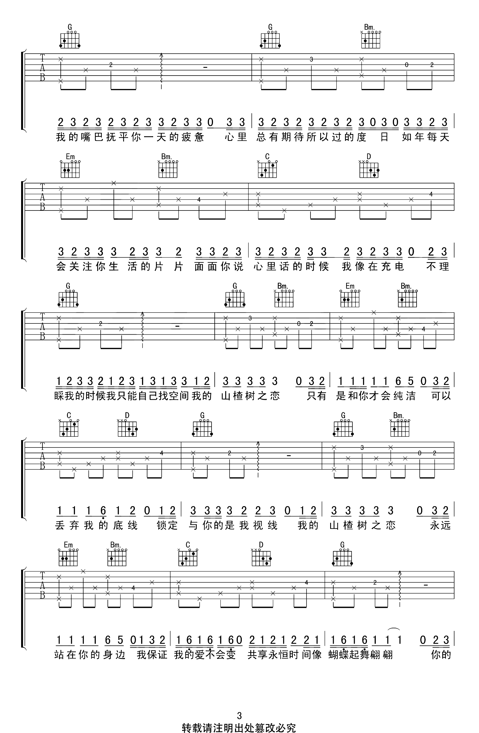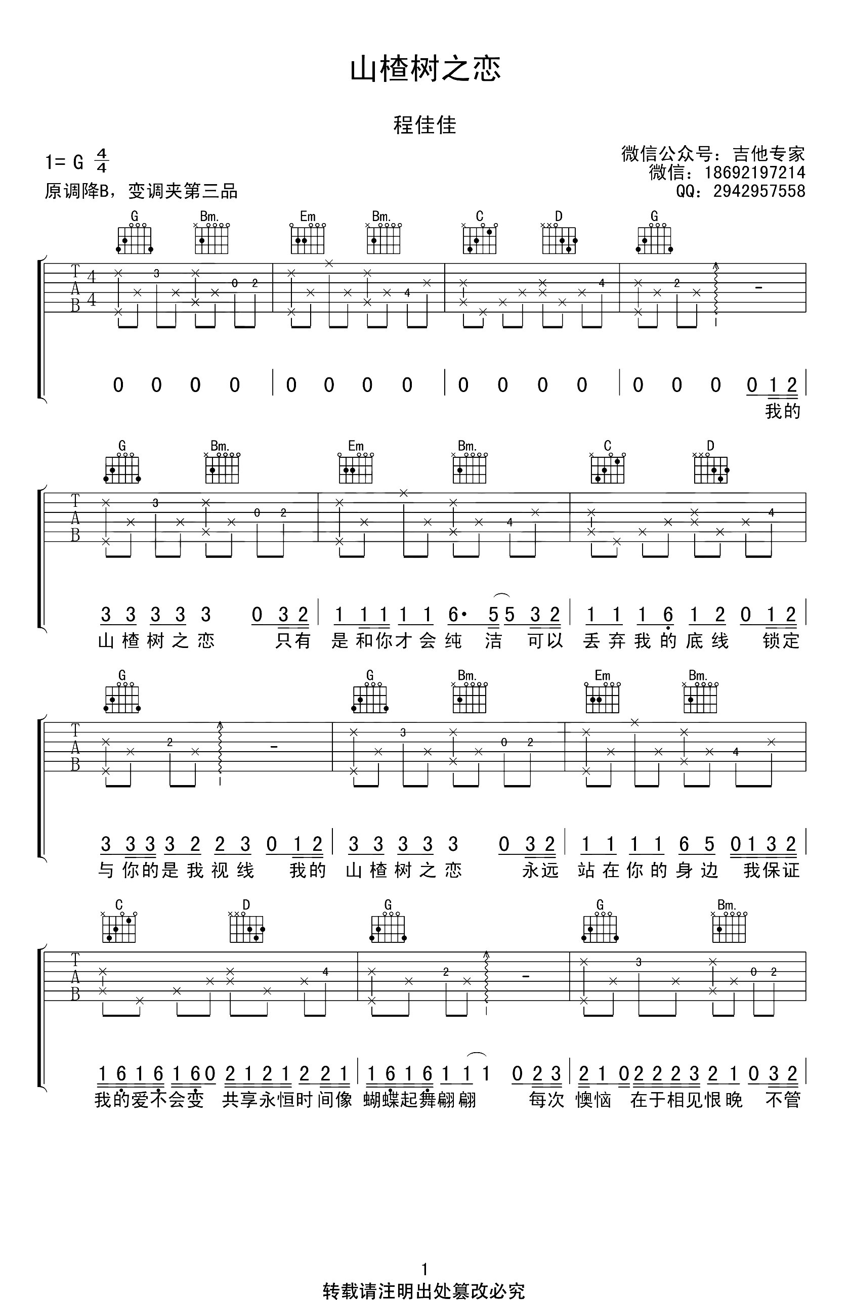 曲谱介绍: 山楂树之恋吉他谱,程佳佳演唱的一首网络热门歌曲。把前奏弹完了,后面都是一样了,如果觉得一个人不太好弹唱,也可以改简单,只弹和弦伴奏就可以啦。 《山楂树之恋》吉他弹唱谱,原调降B,选用G调和弦指法编配,变调夹夹三品,完整版共五张高清图片谱例。
