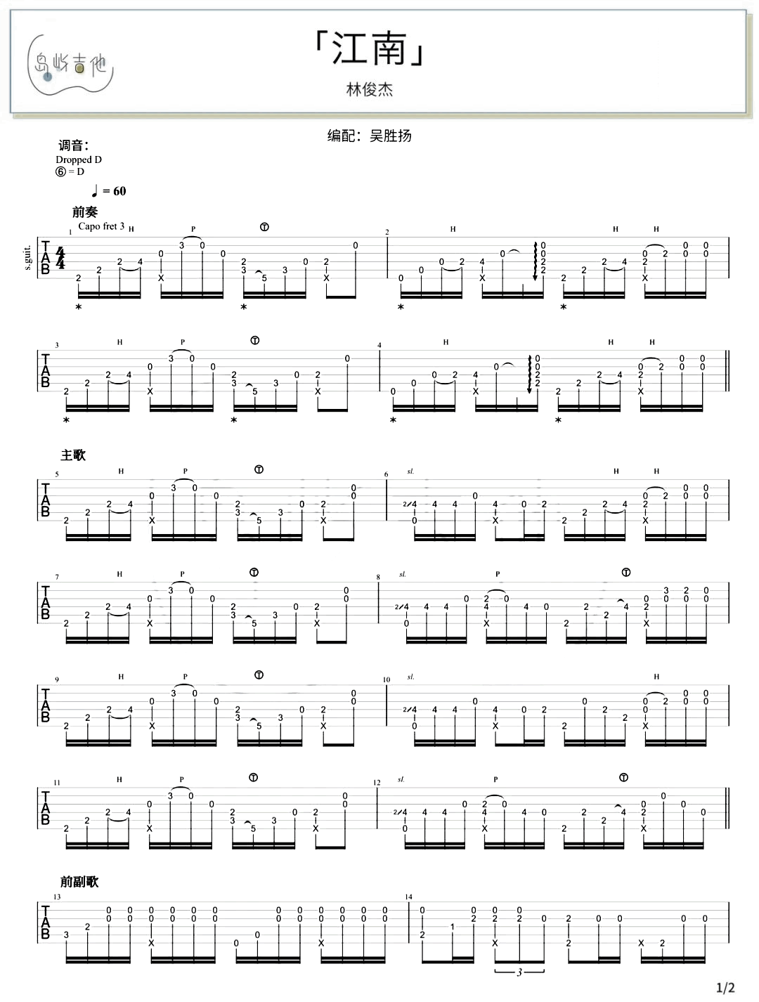 江南吉他谱 - 林俊杰 - 吉他独奏谱