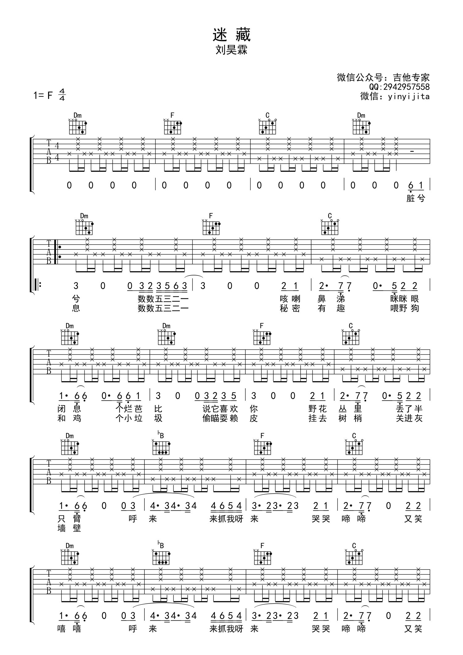• 迷藏吉他谱 - 刘昊霖 - 吉他弹唱谱第1张