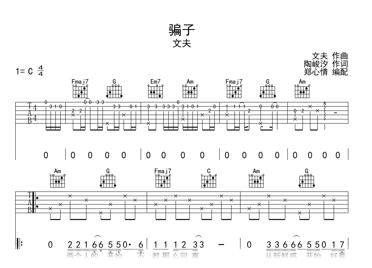 曲谱介绍: 骗子吉他谱,文夫的一首热门歌曲,《骗子》吉他弹唱谱,C调编配,原调不夹变调夹。演奏时速度可保持每分钟68拍,曲谱简单易上手。