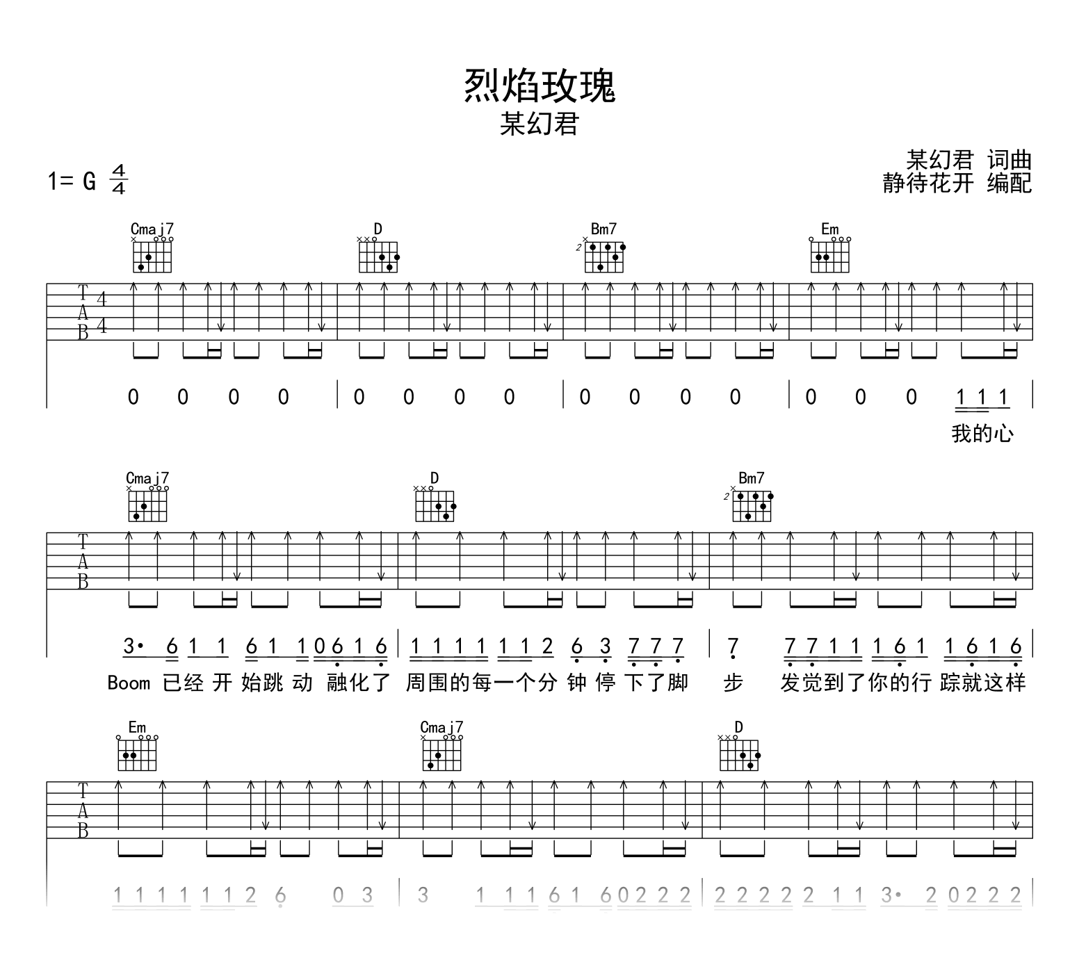曲谱介绍: 烈焰玫瑰吉他谱,某幻君演唱,《烈焰玫瑰》吉他弹唱谱,编配扒谱采用G调和弦指法编配,速度在每分钟90拍左右,演奏难度简单。