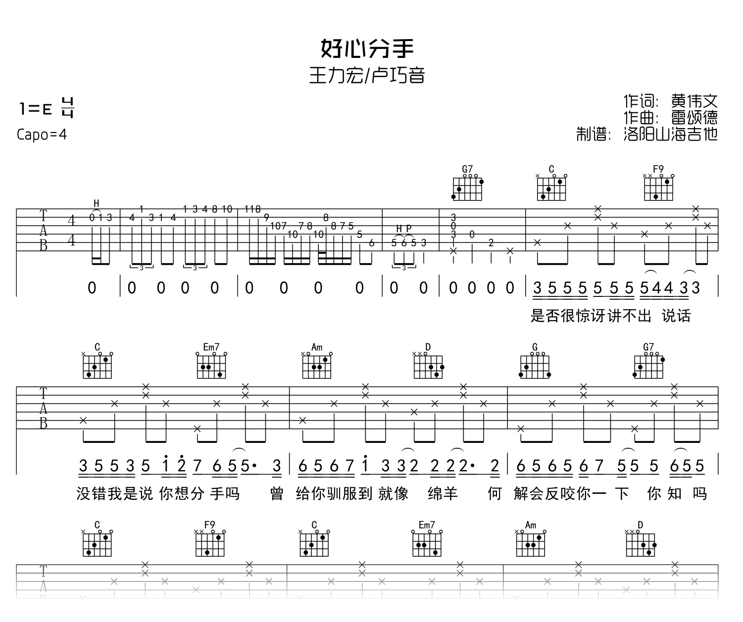 曲谱介绍: 好心分手吉他谱,王力宏/卢巧音演唱的一首国粤语合唱经典歌曲,也是KTV点唱率很高的一首对唱情歌,将男女分手的心情表达得淋漓尽致,附示范音频方便琴友们参照练习。 《好心分手》吉他弹唱谱,原调E,选用C调指法编配,Capo夹四品,共两张高清图片谱。