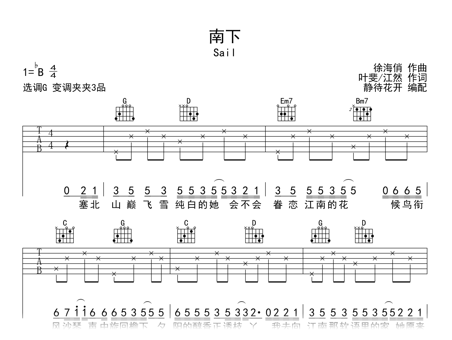 曲谱介绍: 南下吉他谱,Sail翻唱完整版本,《南下》吉他弹唱谱,来自徐海俏的一首民谣创作歌曲。编配扒谱采用G调和弦指法编配,变调夹夹第3品,原调bB调,速度在每分钟70拍左右,演奏难度简单。共两张高清图片六线谱。