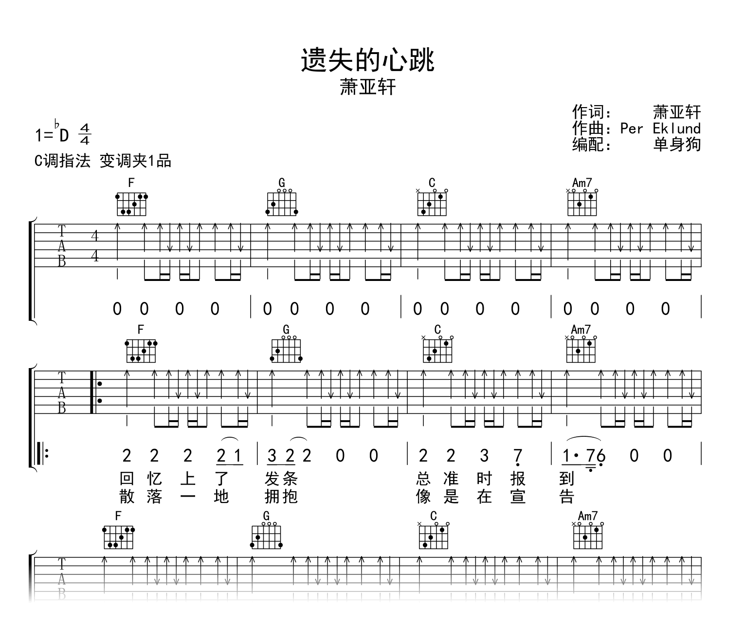 遗失的心跳吉他谱 - 萧亚轩 - C调吉他弹唱谱