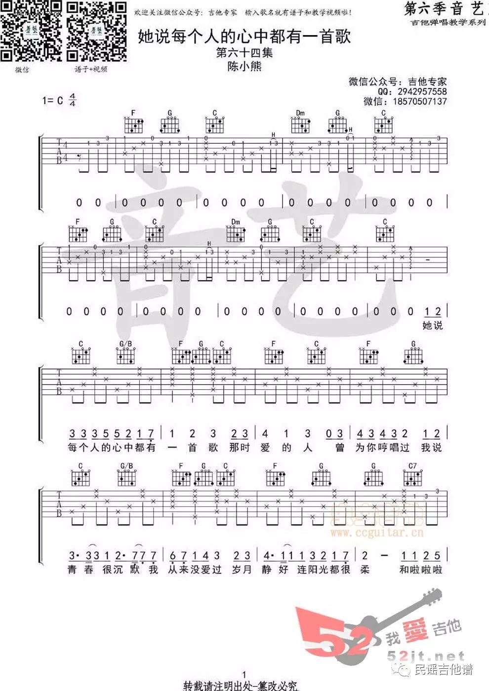 她说每个人的心中都有一首歌 陈小熊 C调吉他谱 - 她说每个人的心中都有一首歌 - C调吉他弹唱谱
