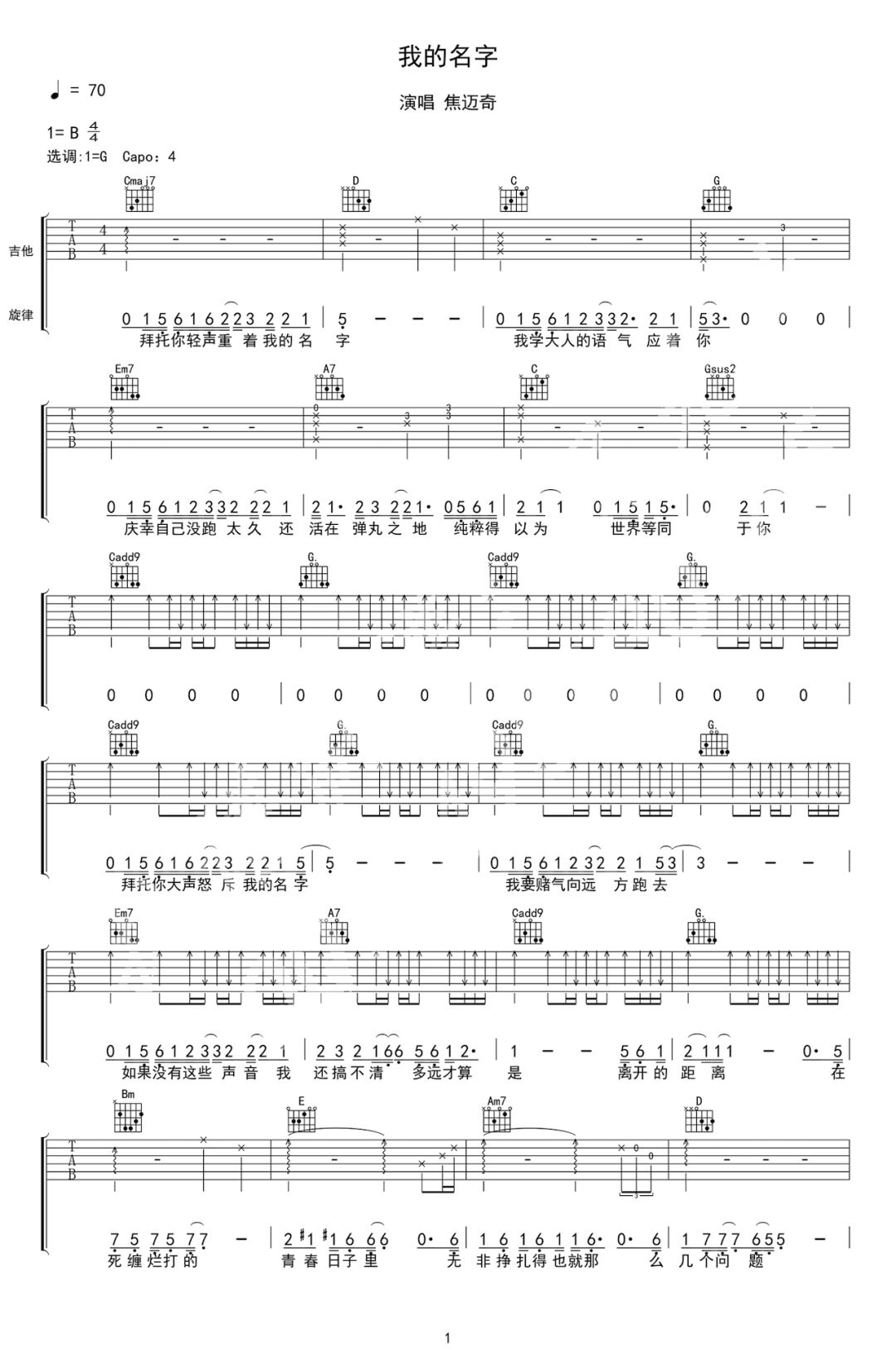 曲谱介绍: 《我的名字》是由独立音乐人焦迈奇录唱的歌曲。这首歌合成器的回响、原声吉他搭配流畅的鼓点,清清爽爽,副歌一句轻混声转音透出青涩的少年感。此版本的曲谱来源于吴先生扒谱制谱,歌曲原调为B调,这里采用G调指法根据原版进行编配,演唱时夹变调夹4品。谱子编配得比较简单,和弦和节奏型都比较常规,很容易练习。