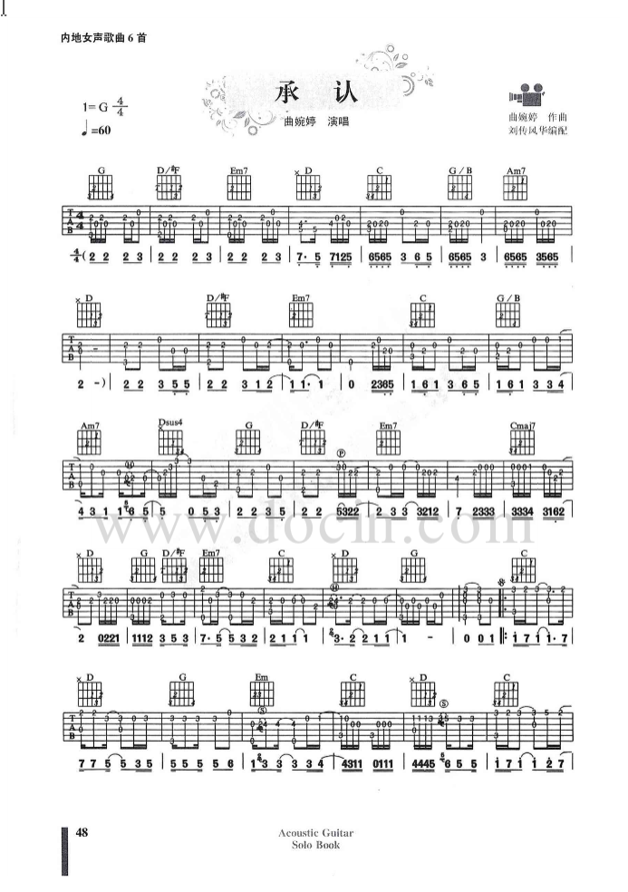 曲谱介绍: 承认吉他谱采用了G调指法,由刘传风华编谱。《承认》是曲婉婷作词、作曲、演唱的歌曲,这首歌是典型的曲婉婷风格,《承认》是一首大胆的"表白歌",也是一首"倒追男生"的歌,"你承认吧,你需要我,可你需要更多的是勇气;我承认了,我需要你,因为我已经无力再抗拒",歌词尽显曲婉婷性格的直爽。这首歌的讲述曲婉婷怎样将男生倒追到手的故事,为了为了达到目的,她甚至不惜用绳子捆绑男主角,非常强势。