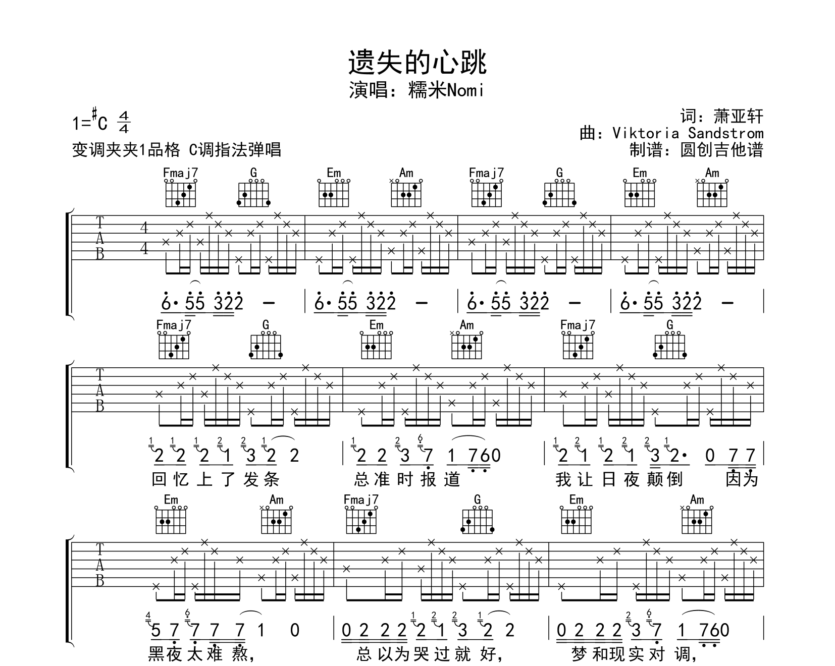 曲谱介绍: 《遗失的心跳》吉他谱, 糯米Nomi演唱,《遗失的心跳》吉他弹唱谱,由圆创吉他编配制谱,本吉他谱采用C调和弦指法编配,推荐变调夹夹第1品演奏,原调#C调,也可以根据个人嗓音条件灵活选择变调夹位置,共3张高清谱图例。